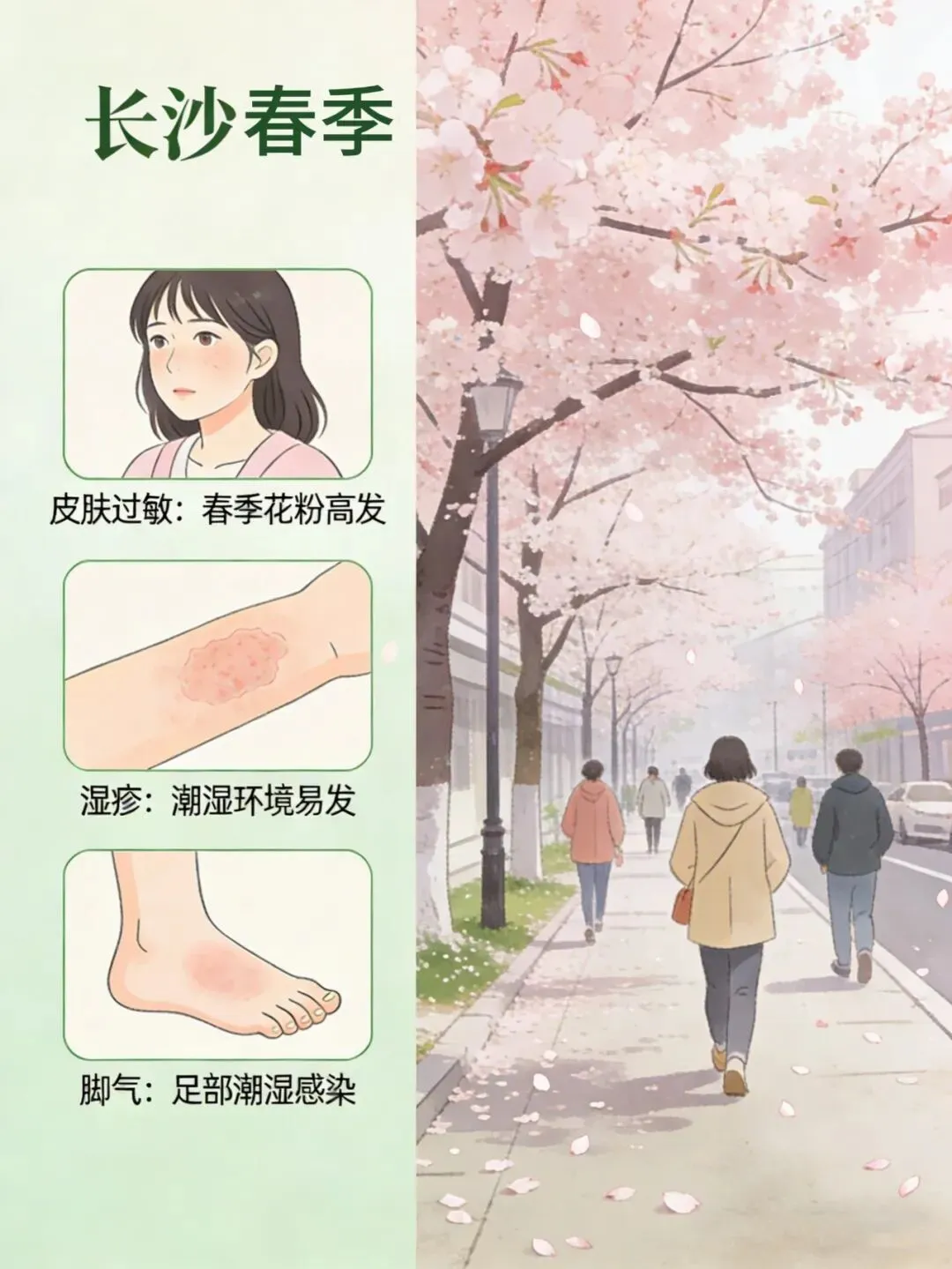 进入 3 月,长沙天气回暖、雨水增多,花粉、柳絮、尘螨、真菌与蚊虫进入活跃期,很多人皮肤开始 “闹脾气”:泛红瘙痒、起疹脱皮、水疱渗液、越抓越重。门诊数据显示,近期过敏性皮炎、湿疹、荨麻疹、足癣(脚气)、虫咬皮炎就诊量明显上升,成为长沙市民春季最困扰的皮肤问题。为什么春季皮肤问题更容易找上门?一是气温波动大,皮肤屏障脆弱;二是湿度升高,真菌繁殖加快;三是花粉、柳絮、尘螨等过敏原增多;四是蚊虫开始活动,叮咬刺激引发炎症。不少人自行涂药膏、用偏方,不仅没好转,还可能加重症状、留下色素沉着或继发感染。一、春季长沙高发皮肤病,你中招了吗?