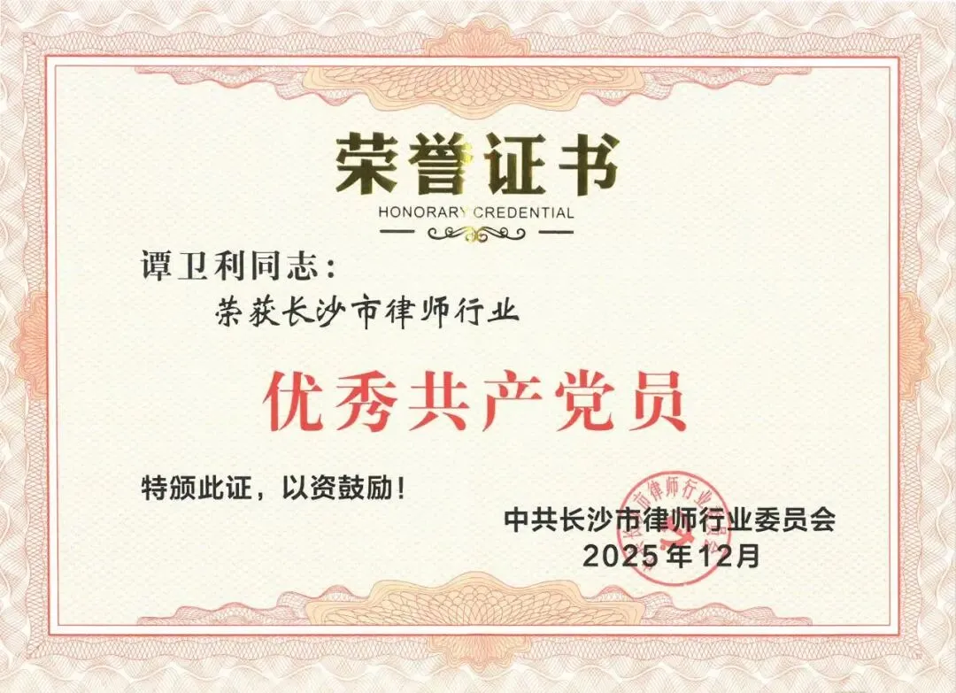 谭卫利律师作为上海市锦天城(长沙)律师事务所高级合伙人,执业十七年来,始终以党员标准严格要求自己,在专业领域精耕细作的同时,积极投身公益法律服务,带头参与普法宣传等社会公益活动,以实际行动践行“人民律师为人民”的宗旨。作为中共上海市锦天城(长沙)律师事务所支部委员会的党员,他积极参与党组织建设,推动党建与业务深度融合,在律所文化建设和行业交流等方面发挥了先锋模范作用。