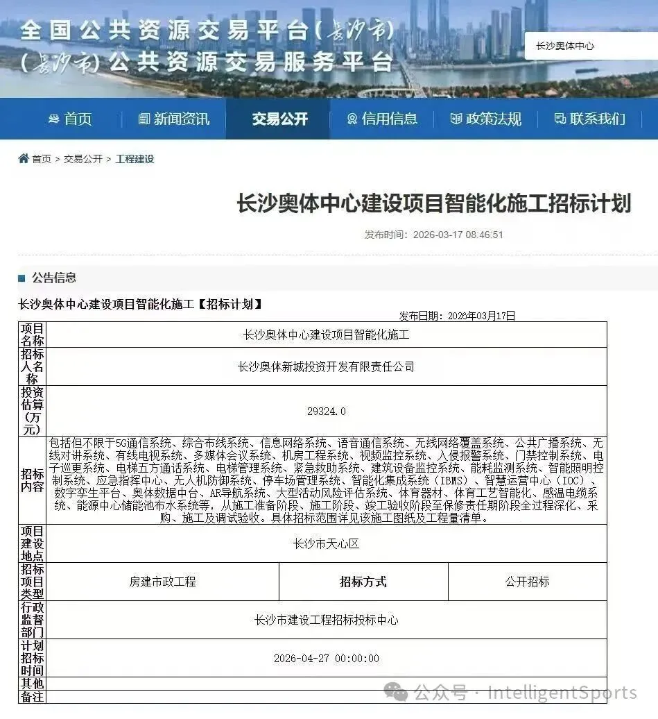 3月17日,长沙奥体新城投资开发有限责任公司发布长沙奥体中心建设项目智能化施工招标计划,标志着国内当前规模最大的单一智能化招标项目正式落地。
