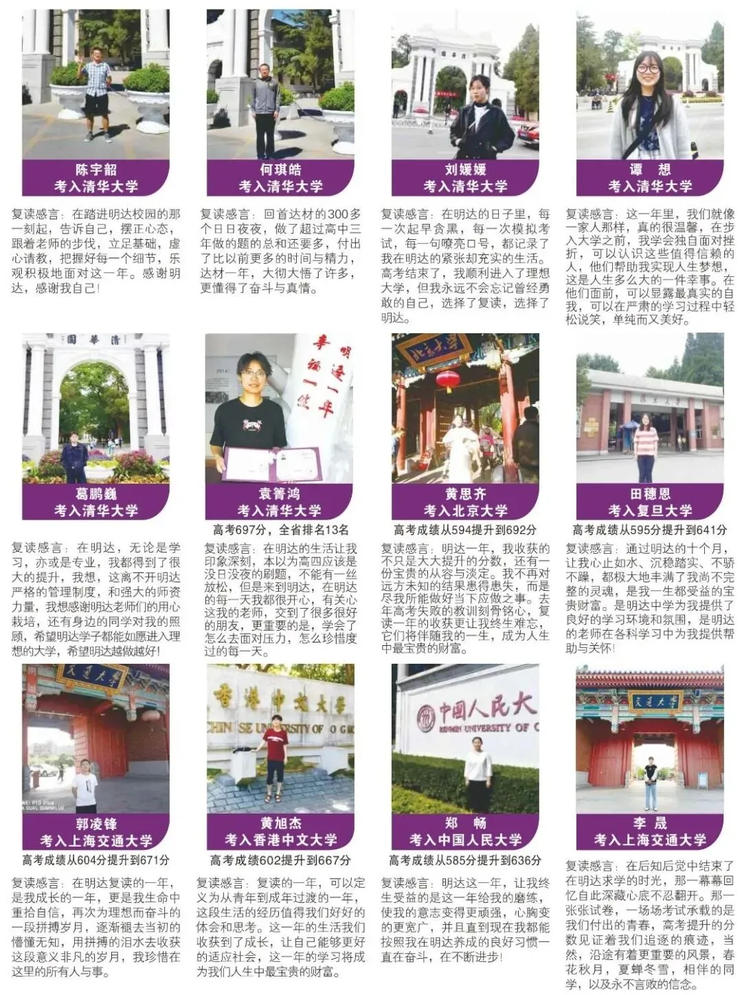 明达高复会持续变革教育理念、备考方略和培养模式,营造独特的高复教育体验,使每个孩子在明达不仅能收获卓越的成绩,更能练就终身受益的技能,真正达成“明达一年,幸福一生”的期望,助力青年自立自强,培育未来的社会栋梁。