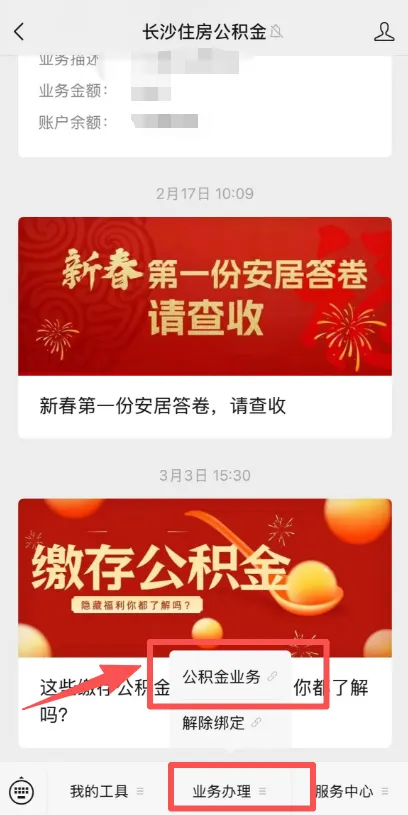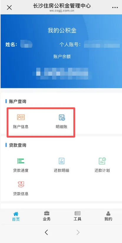 进入【长沙住房公积金】微信公众号,点击业务办理-公积金业务-登录账号,即可查看账户余额