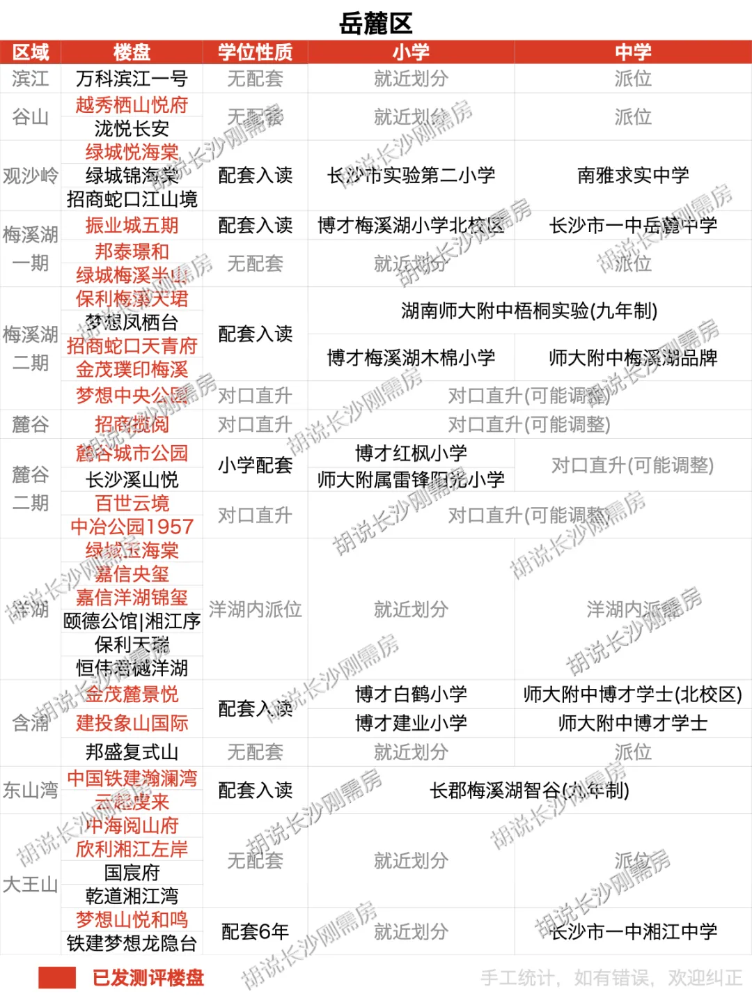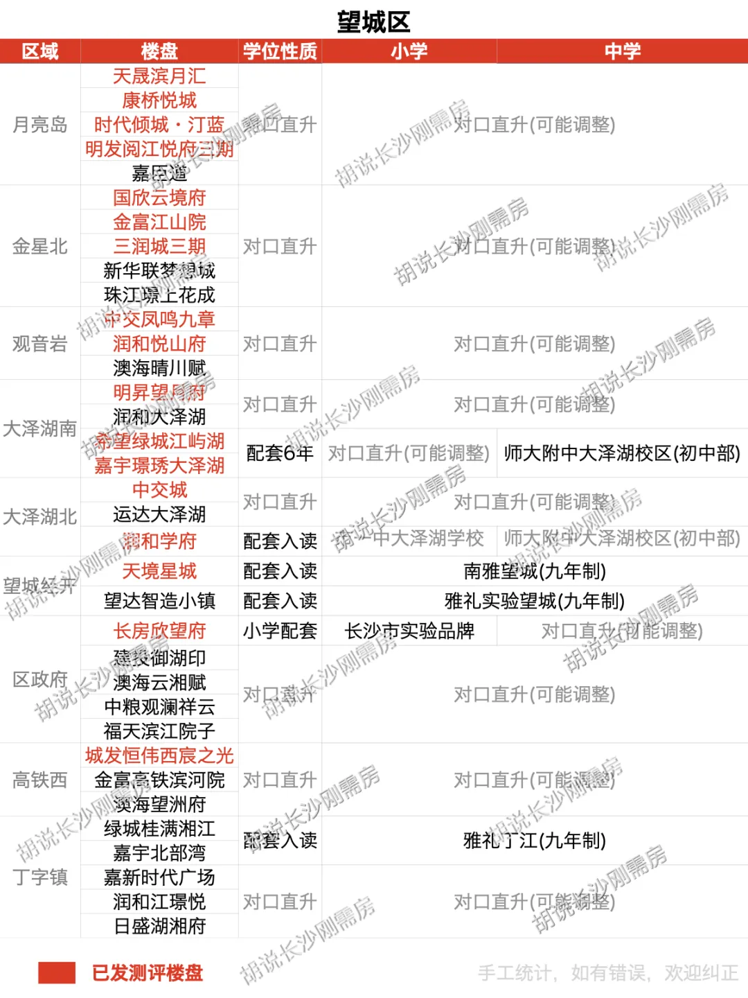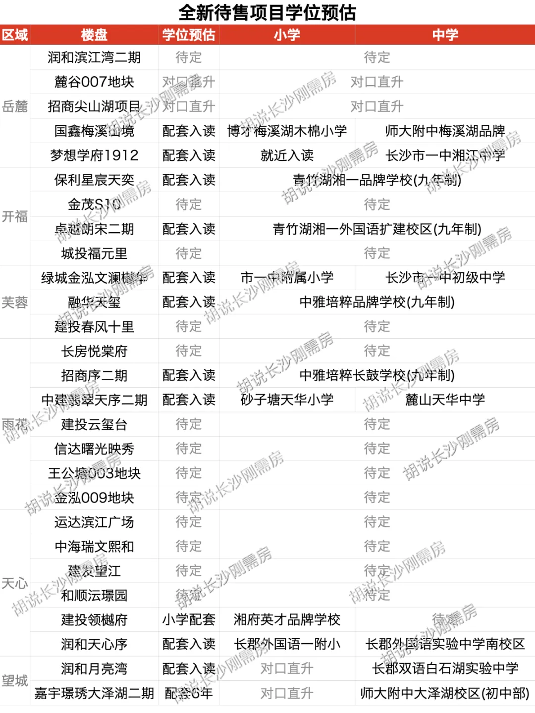 观沙岭:绿城悦海棠、绿城锦海棠、招商蛇口江山境(长沙市实验二小+南雅求实中学)梅溪湖一期:振业城五期(博才梅溪湖小学+长沙市一中岳麓中学)大王山:梦想山悦和鸣、中国铁建梦想龙隐台(长沙市一中湘江中学(配套6年))高新区:麓谷一期及麓谷二期等属于对口直升,短期内也算配套入读,但未来存在调整的可能;洋湖是洋湖范围内派位,或可以理解为颗粒度较大的“配套入读”高岭:上置绿洲雅宾利、城发恒伟北城首府(九年制青竹湖湘一外国语健翔学校)青竹湖:卓越朗宋(九年制青竹湖湘一外国语扩建校区)高铁新城:中欣澜庭序(九年制长沙市一中东山学校),长和宋(一中雨花新华都学校)环保科技园:星泽61号院(九年制师大附中雨花经开学校)暮云:幸福庄园御园(师大附中双语幸福+一中城南中学)、领航学府(品牌小学+一中城南中学)大泽湖北:润和学府(长沙市一中大泽湖学校+师大附中大泽湖校区(初中部))望城经开:天境星城(九年制南雅望城学校)、望达智造小镇(九年制雅礼实验望城学校)丁字镇:绿城桂满湘江、嘉宇北部湾(九年制雅礼丁江)望城区全区采用对口直升模式,短期内也算配套入读,但是未来存在调整的可能梅溪湖二期:国鑫梅溪山境(博才梅溪湖木棉小学+师大附中梅溪湖品牌中学)湘江科学城:梦想学府1912(长沙市一中湘江中学)开福中心:保利星宸天奕(九年制青竹湖湘一品牌学校)青竹湖:卓越朗宋二期(九年制青竹湖湘一外国语学校扩建校区)芙蓉中心:绿城金泓文澜樾华(长沙市一中附属小学+长沙市一中初级中学)红星:中建翡翠天序二期(砂子塘天华小学+麓山天华中学)黑石铺:润和天心序(长郡外国语一附小+长郡外国语南校区)大泽湖南:嘉宇璟琇大泽湖二期(师大附中大泽湖校区(初中部))近期热门: