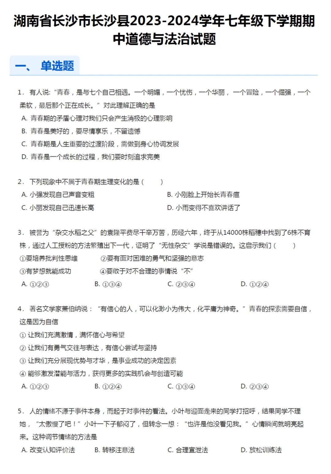 >14套2021-2024年湖南长沙初一下学期期中政治试卷及答案解析