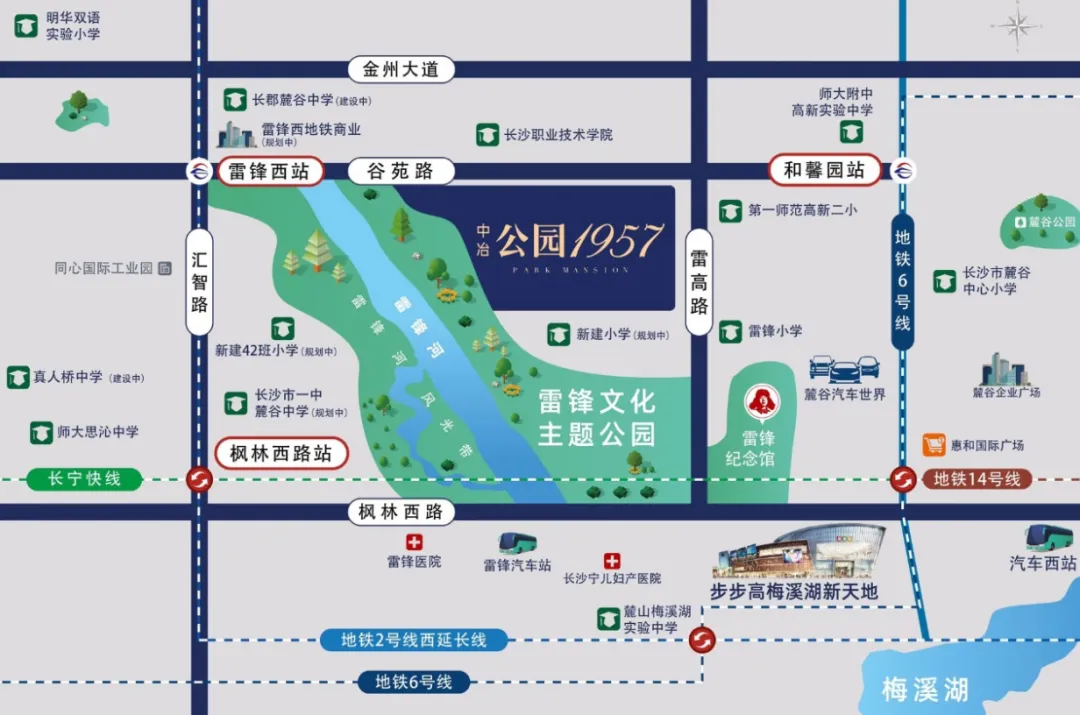 距离在建的地铁2号线西延线雷锋西站约450米,步行10分钟内可达,未来地铁开通后通勤便捷。周边有金荣同心工业园、长沙智谷等产业园区,就业通勤便利,适合互联网、制造业等从业者。居住舒适度好