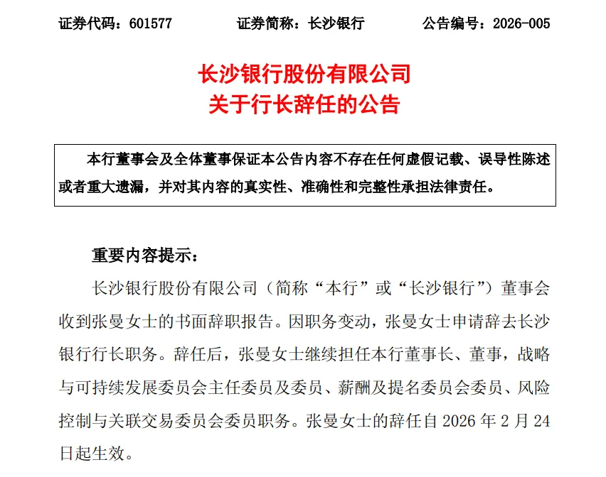 2026 年 2 月,长沙银行发布公告,张曼辞去行长职务,正式升任董事长,在新任行长到岗并获监管核准前,由其暂代行长职责,这家湖南首家万亿资产城商行,再度陷入行长职位空缺、核心管理层动荡的局面。近三年行长岗位频繁更迭,如今迟迟难以补位,叠加营收增速放缓、资产质量承压、股价表现低迷,长沙银行正站在战略转型与风险化解的关键十字路口,其困境也折射出当前中小城商行共同的生存难题。