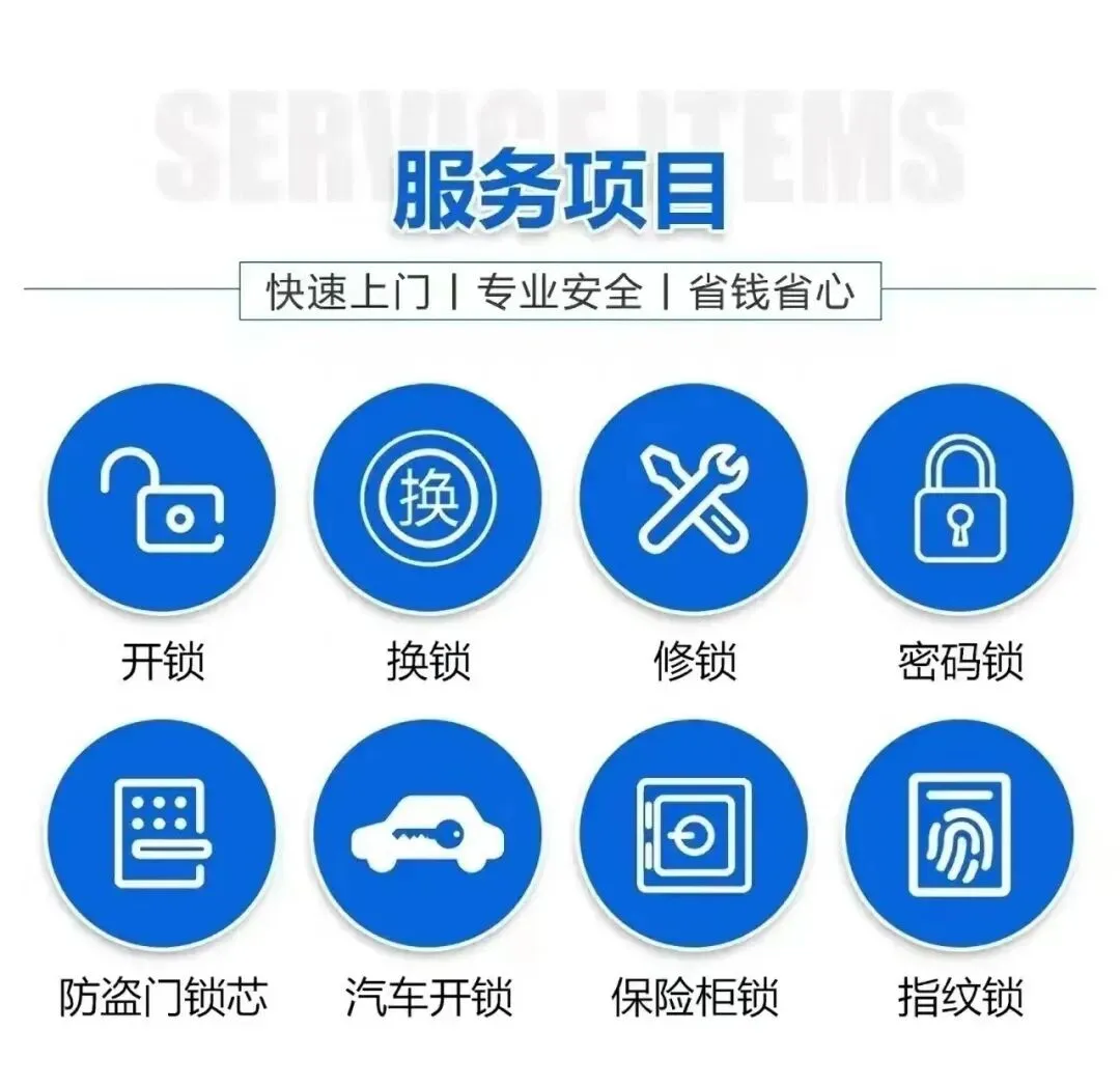 🔧 服务内容1️⃣ 开锁服务:为您提供各类开锁服务,包括家门、车门、保险柜等,确保不损坏任何锁具。2️⃣ 换锁服务:当门锁出现故障或老化时,我们提供专业的锁具更换服务,保障您的安全。3️⃣ 开锁抢修服务:在紧急情况下(如钥匙丢失、锁芯损坏等),我们提供24小时抢修服务,帮助您及时解决问题。4️⃣ 智能锁安装与维修:我们提供智能锁的安装与维修服务,提升您家居与办公环境的安全性和便捷性。5️⃣ 钥匙配制服务:精准的钥匙配制服务,确保您的钥匙使用安全,防止重复开锁或遗失造成不必要的麻烦。
