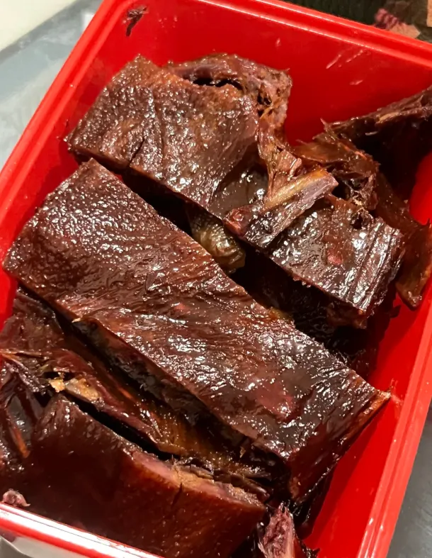 这里的“酱板鸭”特别讲究。鸭子用花椒、八角、桂皮先卤,再晒风三天,最后进锅慢炸。外皮脆硬,有点韧筋,咬一口油香直冒,又咸又香,让人停不下筷。