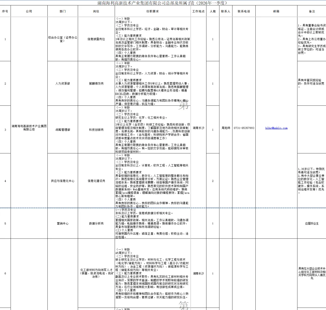 任职资格条件详见《湖南海利高新技术产业集团有限公司总部及所属子公司公开招聘岗位任职要求与岗位职责》(见附件1)。