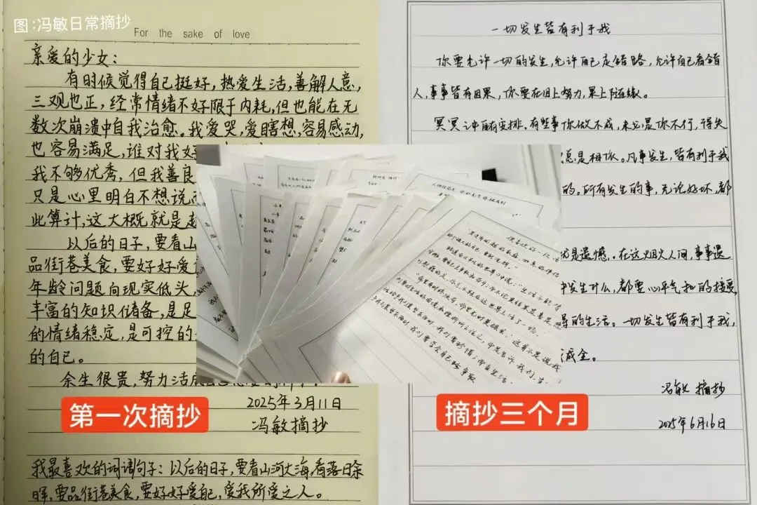 2025年3月,淼淼组建摘抄群,带着大家读书、写字、静心。那时候冯敏工作繁忙,全天带班还要照顾全托孩子,每天累到倒头就睡,她一度觉得,自己连十分钟的空闲都挤不出来。可抱着试一试的心态,她还是加入了,这一坚持,就是好几期,从未间断。她抓住孩子们午睡的碎片时间,关掉所有嘈杂,放下所有身份,安安静静拿起笔抄写文字。从最初的机械书写,到慢慢沉下心,那些被生活裹挟的焦虑、慌乱、疲惫,在一笔一画里慢慢被抚平。她开始享受独处的时光,在文字里找到共鸣与力量,也慢慢解锁了阅读、写成功日记、面对镜头表达,原本枯燥忙碌的日子,终于有了温度和向上的痕迹。2025年4月,一本《被讨厌的勇气》彻底点醒了她,书中“课题分离”四个字,让她瞬间释然。从前的她,总在意别人的看法,为别人的情绪委屈自己,读懂课题分离后她才明白:别人的评价是别人的课题,自己的活法才是自己的人生,不必为他人的眼光内耗。从一开始读不懂《蛤蟆先生去看心理医生》,到慢慢品读治愈内心;从共读《认知觉醒》打破固有思维,到主动报名担任《为何家会伤人》共读主持人,这对曾经胆小自卑、不敢说话的她来说,是想都不敢想的突破。她渐渐懂得,阅读从来不是简单的看书,而是修心、修格局、修底气,让她在文字里,慢慢与自己和解。从前的冯敏,看到镜头就躲,说话就紧张,总觉得自己不够好。在淼淼的鼓励下,她开始刻意练习直面镜头,恰逢大女儿毕业需要录制寄语,原本担心卡壳的她,竟然一遍顺利完成。那一刻她深知,所有默默的努力都不会白费。从“我不行”到“我试试”,她一点点打破自我设限,变得从容又自信。她和家人定下每周固定的家庭会议,没有指责、没有说教,只有倾听与分享,听孩子说心里话,和家人聊感受,让小家满是温暖。她也终于明白,最好的家庭教育,是看见与陪伴;最好的爱,是坐下来好好听孩子说话。2025年七八月,缺少了淼淼的直接带动,冯敏一度懈怠拖延,重回被动状态,甚至自我怀疑。可这段低谷,反而让她看清内心:她真的渴望成长,不想再回到那个迷茫空洞的自己。同年11月,当淼淼邀请她加入10分钟读书驿站时,她毫不犹豫报名。此前因家里装修,399元的费用曾让她纠结不已,而这一次,她没有犹豫:这不是消费,而是对自己的投资,是终于学会把自己放在心上,好好爱自己。她格外感恩彦彦老师搭建的这个温暖平台,让普通妈妈有了学习、发光、被看见的地方,也感恩遇见一群同频姐妹,彼此鼓励,相伴成长。而这次早课分享,更是她主动给自己安排的突破,不为完美,只为勇敢迈出第一步。敏悟新生: