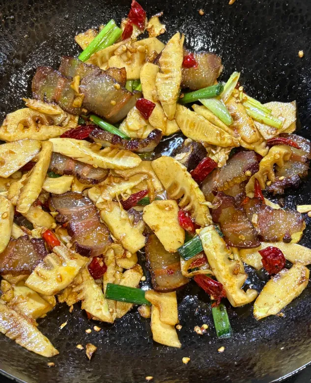 我挺喜欢的一道,是南岳观音笋炒腊肉。做法不复杂,嫩笋先焯水去涩,再和本地腊肉一起下锅,蒜末、青红椒提味,火别太大,让腊香慢慢逼进笋丝里。最后出锅,笋脆,肉韧,咸香里带一点山货的清气。