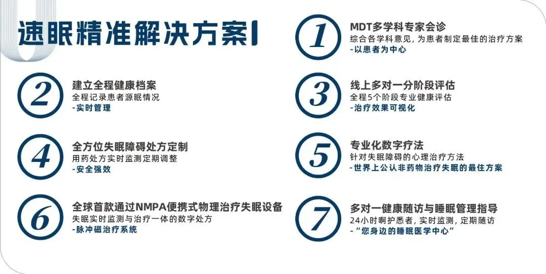 速眠解决方案,是速眠集团以精神心理疾病患者为中心的综合型诊疗方案,以医生集团、优眠医学中心和互联网专科医院为支撑,融合自主研发的速眠脉冲磁治疗系统、CBTI等核心技术,采用多学科病历讨论模式,并融合数字疗法、物理疗法、中医疗法等综合干预手段,以及24小时专家团队在线呵护,为焦虑、抑郁、睡眠障碍、OSA等精神心理障碍群体提供专业的诊疗,并带来全周期诊疗服务,实现患者获益最大化。