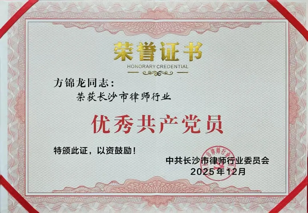 2026年3月20日,长沙市律师行业基层党组织书记现场述职暨2025年度“两优一先”表彰会议在长沙市司法局隆重召开。悦凌总所主任方锦龙律师凭借坚定的理想信念和卓越的专业能力荣获长沙市律师行业“优秀共产党员”称号。