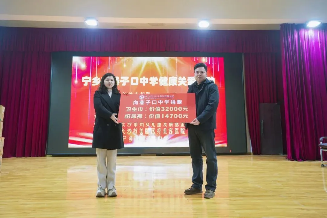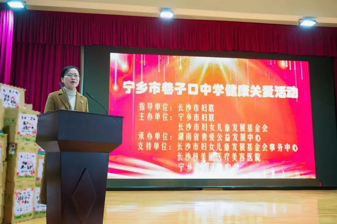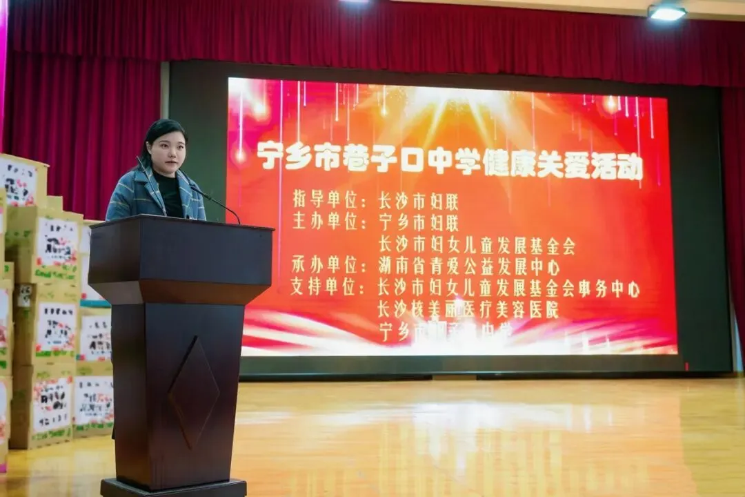 本次活动由长沙市妇联指导,宁乡市妇联、长沙市妇女儿童发展基金会主办,湖南省青爱公益发展中心承办,长沙核美丽医疗美容医院、宁乡市巷子口初级中学等单位联合支持,宁乡市妇联党组书记、主席刘俐华,宁乡市巷子口镇人大主席李双,长沙市妇女儿童发展基金会事务中心副主任程曼,长沙市妇女儿童基金会副秘书长刘雪花,巷子口初级中学校长罗月良等出席活动,活动以“物资帮扶 + 知识科普”的双重形式,直击乡村女童青春期成长痛点,把实实在在的关爱与专业实用的知识送到孩子们身边。