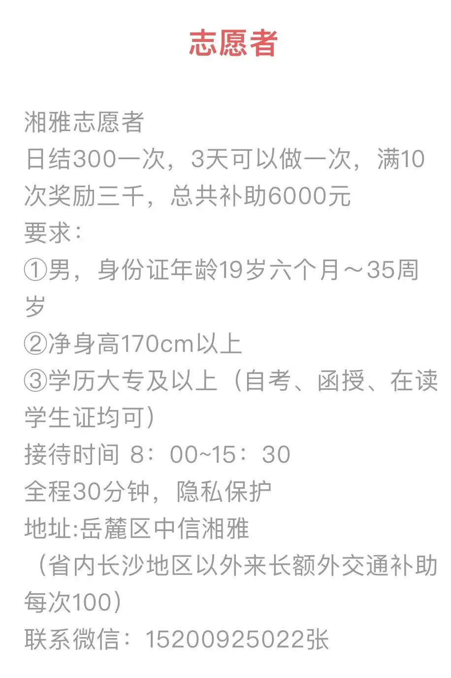 招3.21-22号贺龙演唱会内场安保🌸(必须🈶️保安证,可联系可一天)时间:🌸13:00-23:00左右内容:🌸维护现场秩序等工资:🌸全内场,120包晚饭要求:🌸男,🈵18-50岁,染发的不要,黑短发,无犯罪记录,穿鞋170以上,要本人有保安证,不要有任何疾病的,必须身体健康,上班收手机,介意勿扰集合地址:12:00🌸雨花区建设医院南门联系我+10招3.21-22号贺龙演唱会内场安保🌸(不需要保安证,只能做一天,不能连续)时间:🌸13:0-23:00左右内容:🌸维护现场秩序等工资:🌸50包晚餐要求:🌸男,🈵18-50岁,染发的不要,黑短发,无犯罪记录,穿鞋170以上,必须身体健康,内场,上班收手机集合地址:12:00🌸雨花区建设医院南门联系我+10