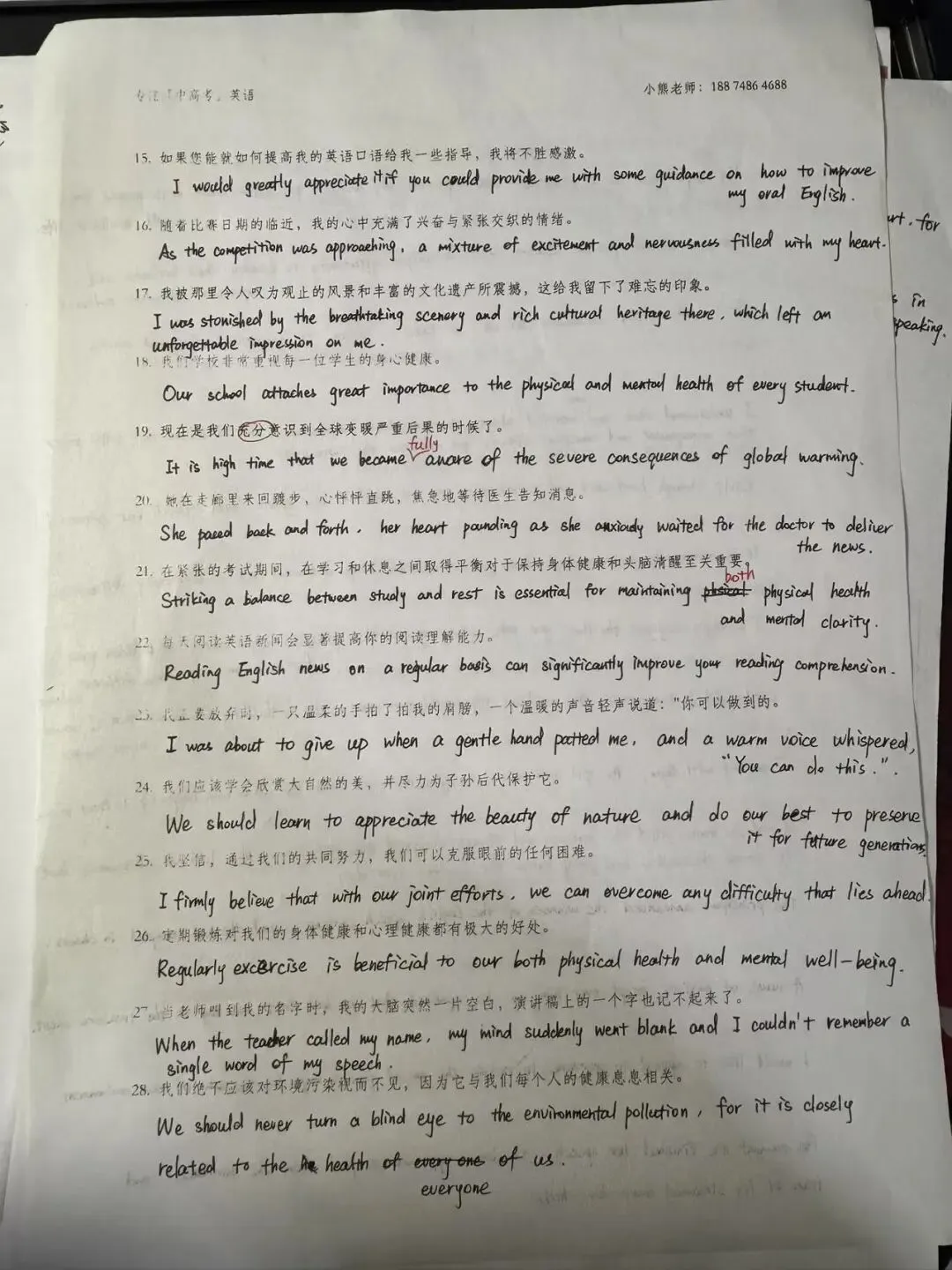 他会老老实实先背,背熟了再默写,默完了认认真真核对答案,错的地方抄一抄、记一记,然后工工整整拍照发群里。
