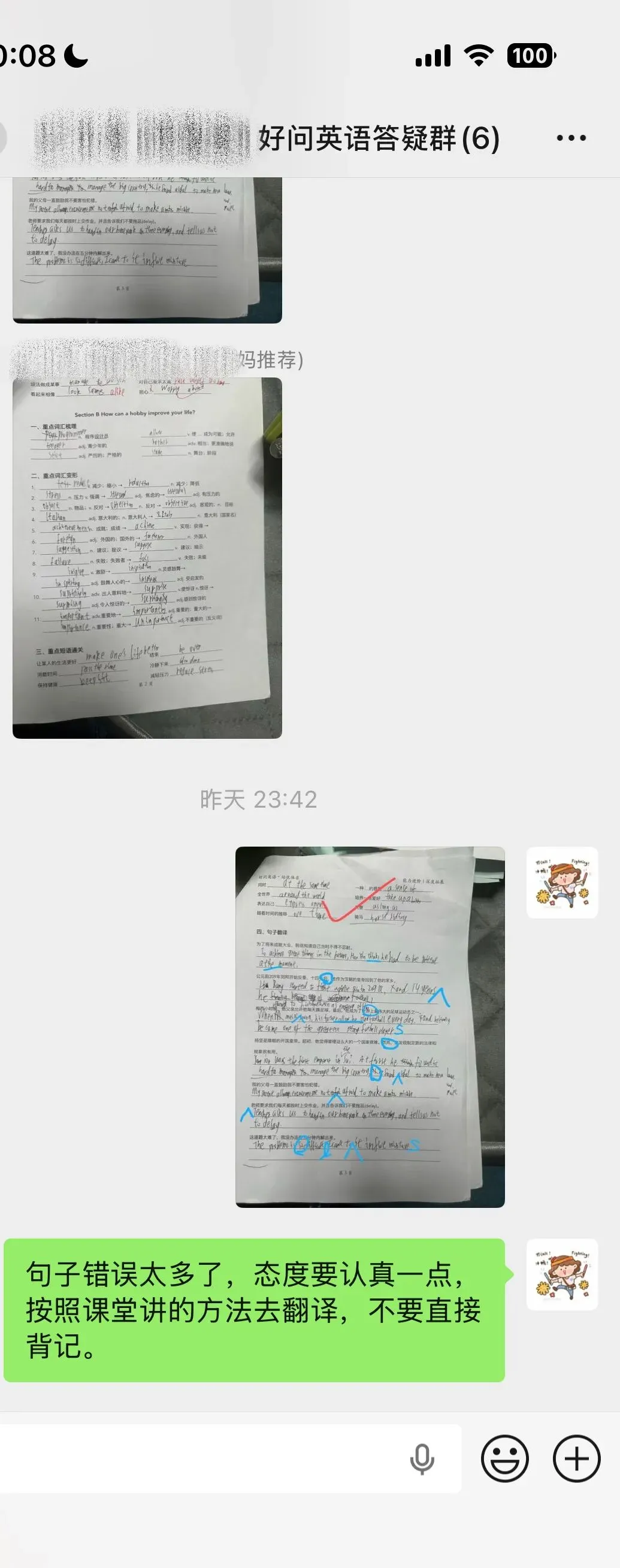 同样是背单词、默写、然后核对答案发群里。