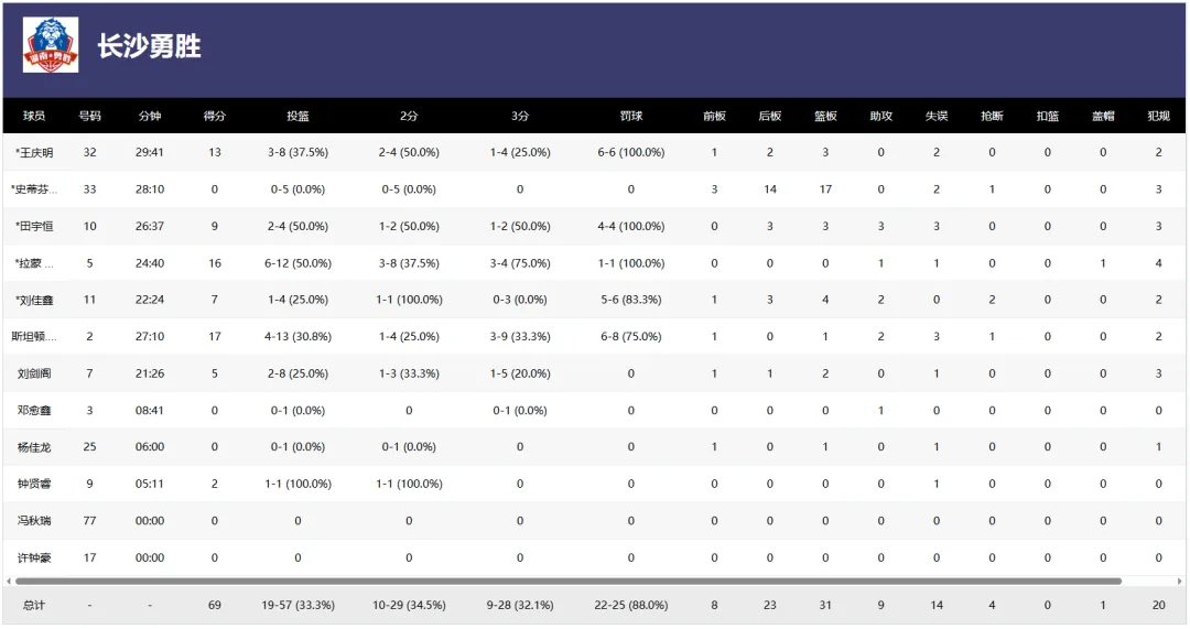 本场比赛,基德17分,加洛韦16分,王庆明13分3篮板,田宇恒9分3篮板3助攻,刘佳鑫7分4篮板,刘剑阁5分2篮板,齐默尔曼17篮板。