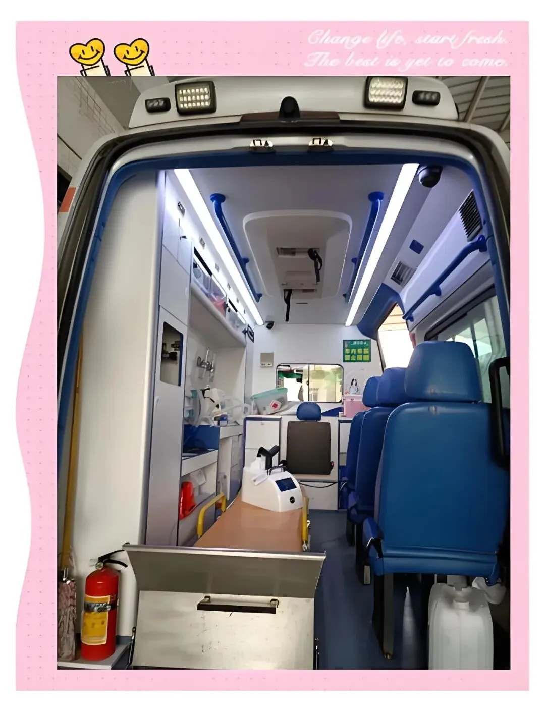 标准车辆:多功能医用救护车,配备折叠担架、轮椅坡道、全车消杀、专业固定装置。