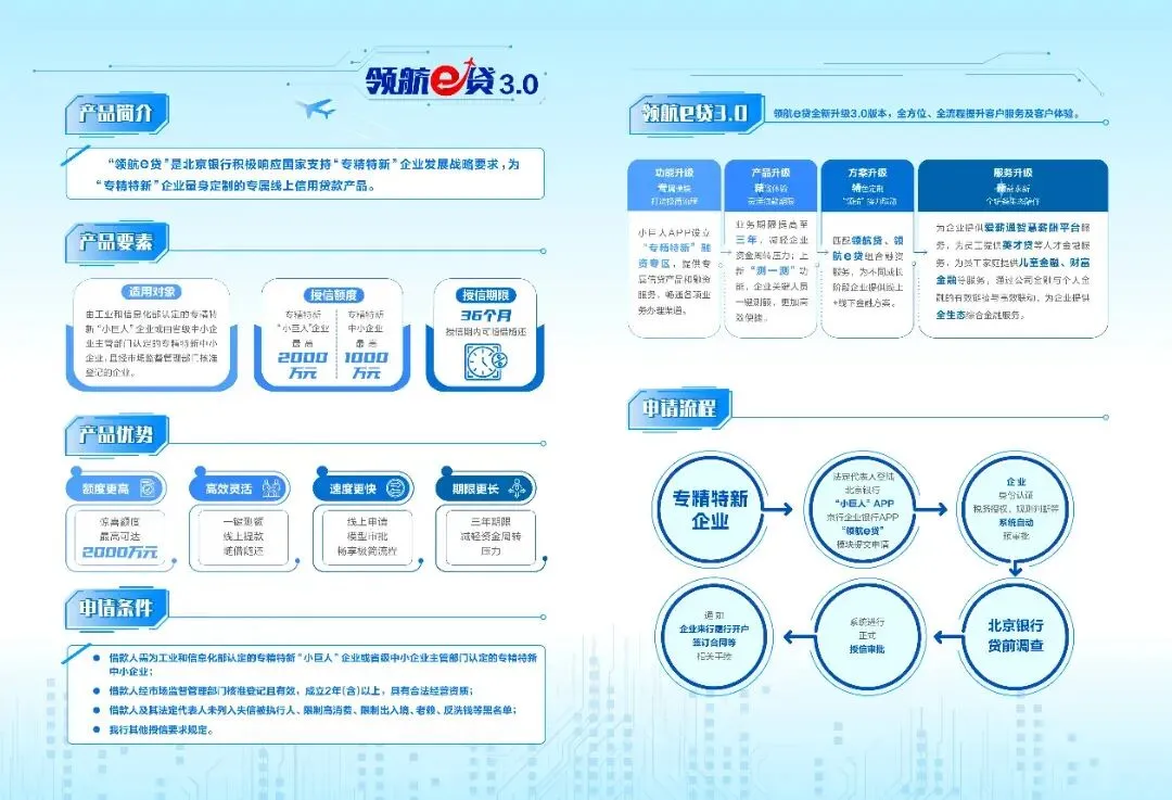 “领航 e贷”:指我行基于对专精特新属性信息、企业纳税信息、知识产权信息以及工商、司法、征信等数据的挖掘和分析,以风控模型与准入规则为核心,向专精特新企业发放的,用于支持专精特新企业生产经营周转的流动资金贷款业务。