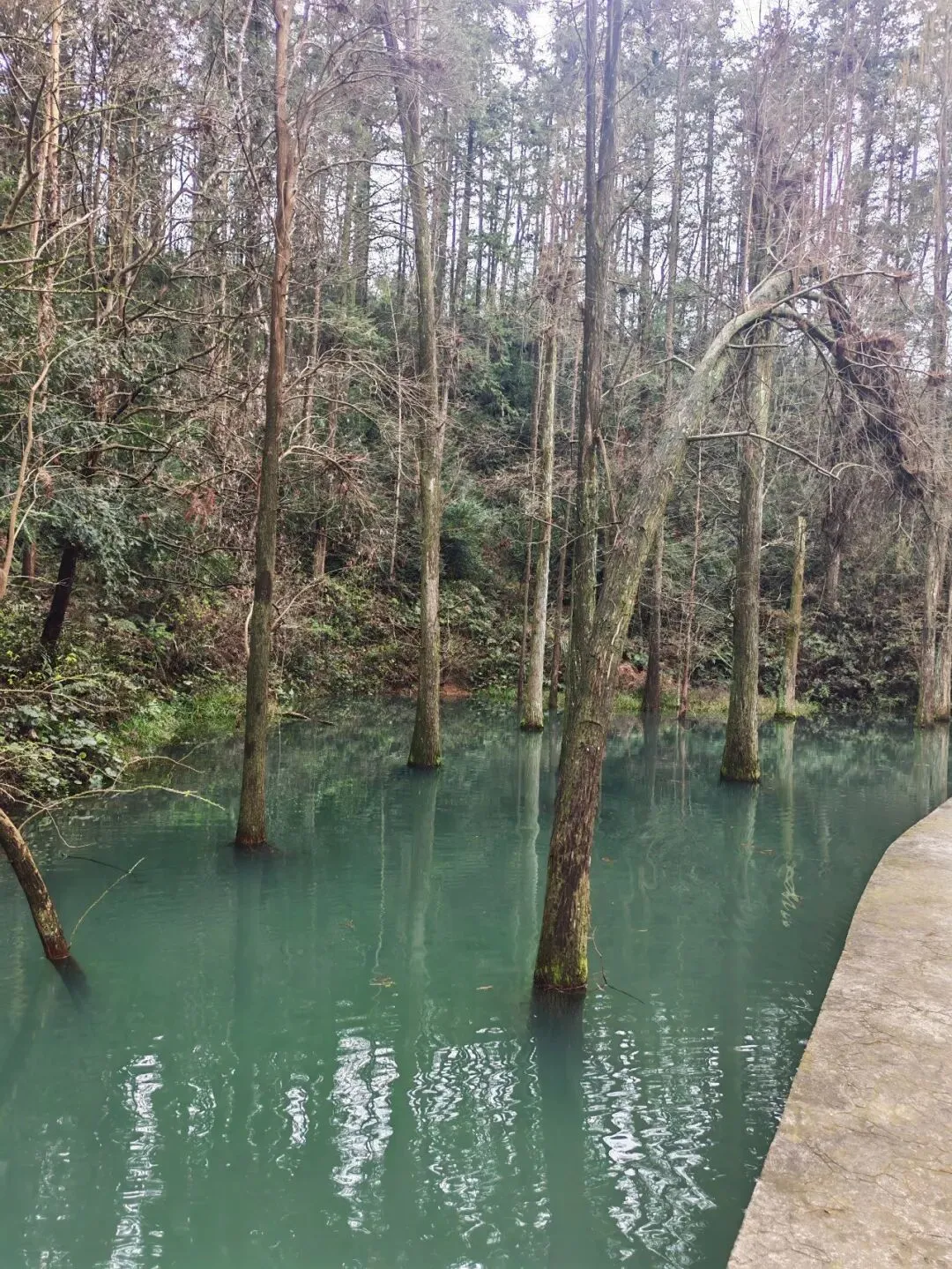 接下来,我又认真寻找,终于在另一片水域找到了我们慕名而来的水上栈道。一排排池杉正生长在一池碧水中。受益于连日春雨,长沙九寨沟,不是虚名。