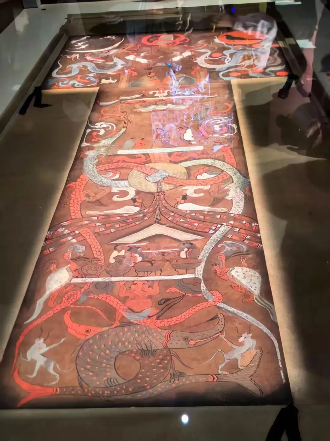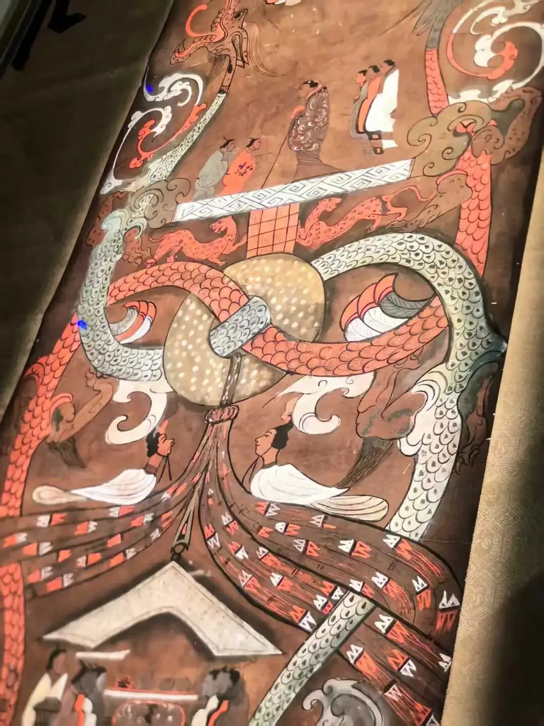 帛画最底部描绘墓主人灵魂回到冥府,由鱼妇(两条交叉蛇形大鱼)引领开启成仙之路,