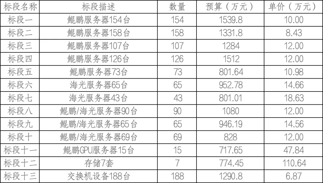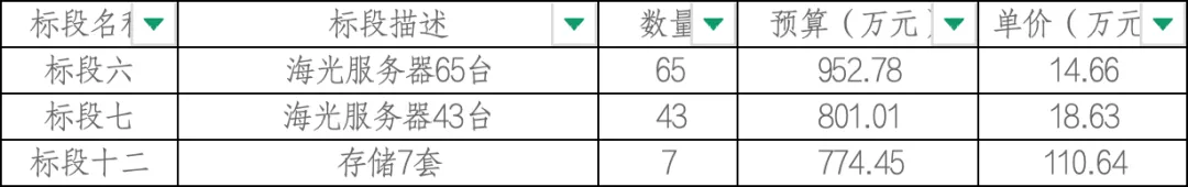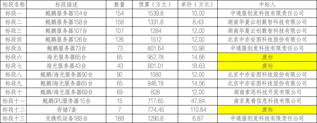 标段六 海光服务器65台;因递交响应文件的供应商不足三家,本标段按废标处理。标段七 海光服务器43台;因递交响应文件的供应商不足三家,本标段按废标处理。标段十二 存储7套;因递交响应文件的供应商不足三家,本标段按废标处理。