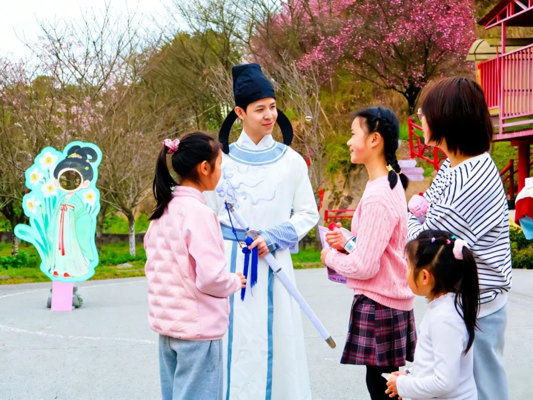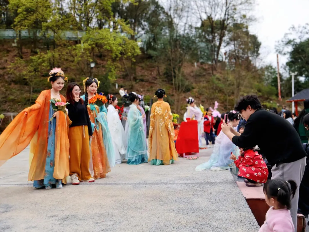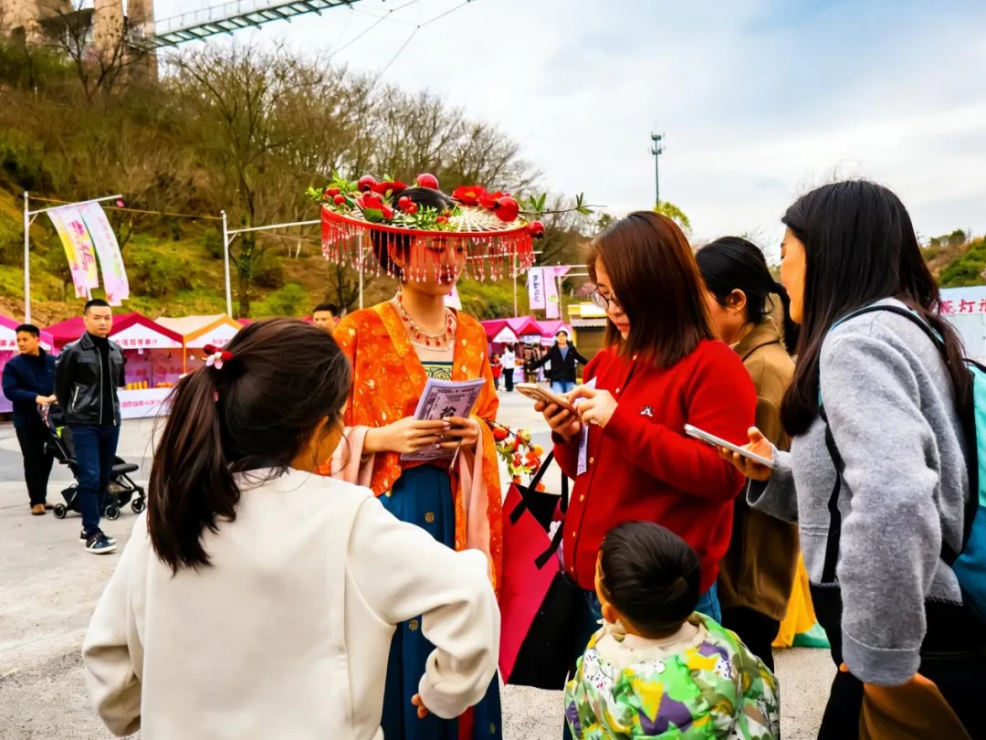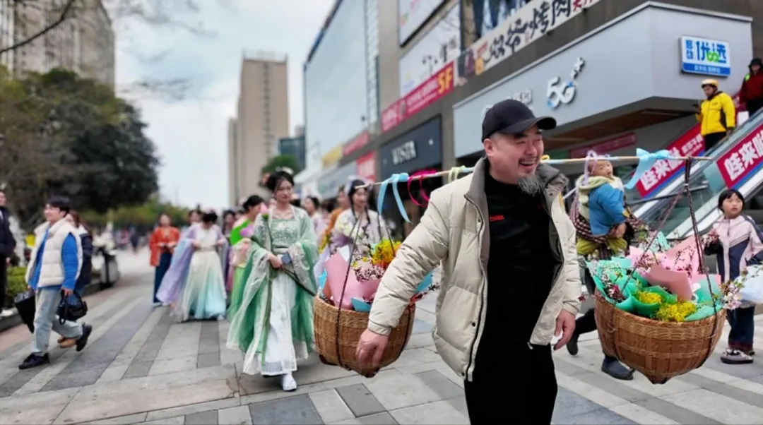 随着悠扬古乐响起,十三位“花神”在商场中庭翩然起舞,将樱花之烂漫、油菜之灿烂、山茶之娇艳化作灵动舞姿。她们手持采摘自果园镇的鲜切花束,连同《花漾果园推荐线路》一并赠予过往市民,让“花神”意象从古籍走入现实。