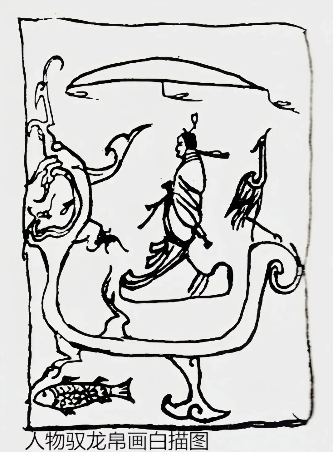《人物驭龙帛画》画面正中绘头戴高冠、身穿博袍、腰佩长剑的男子,当为墓主人形象。他侧身立于龙身,头顶有一华盖;龙昂首卷尾,躬身成舟,舟尾立鹤(凤),舟旁有一鲤鱼随行。人物衣着的飘带、华盖的垂穗呈飘逸状,表示了风动的方向,可见龙舟迎风前进的态势。画面简洁而具有神秘意味,“导引灵魂升天”的意图跃然绢上。这幅帛画的人物形象刻画生动传神,表现面部的线条精微而细腻,使须眉毕现,神情宛然;表现服饰的线条则流畅舒展,恰到好处地表现了长袍的质感和飘逸的状态,被誉为中国早期肖像画的杰出代表。