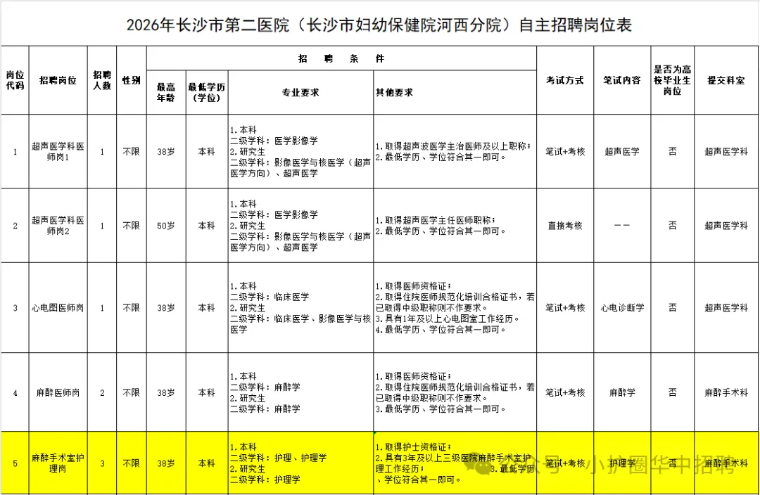 此次招聘岗位11个,招聘计划16名,详见《2026年长沙市第二医院(长沙市妇幼保健院河西分院)自主招聘岗位表》(附件1)。