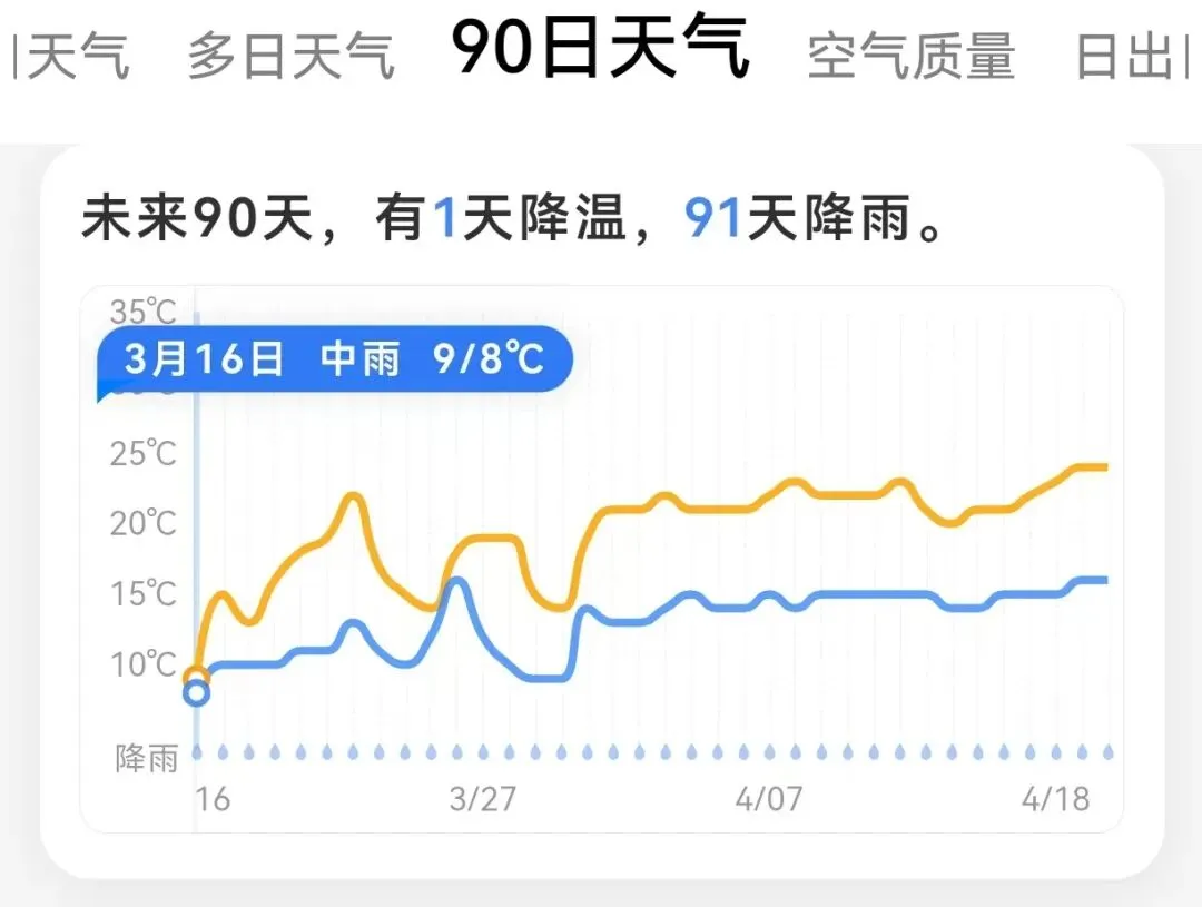 让我有些神往,而现在是返潮的镜子,越晒越臭的衣物,让我有点厌烦这个雨季,我该怎么办?更令我伤心的是网上说的82天的下雨天实际上比我截到的天数还少,因为我截到了91天,看到的第一眼是震惊然后截图,附图为证: