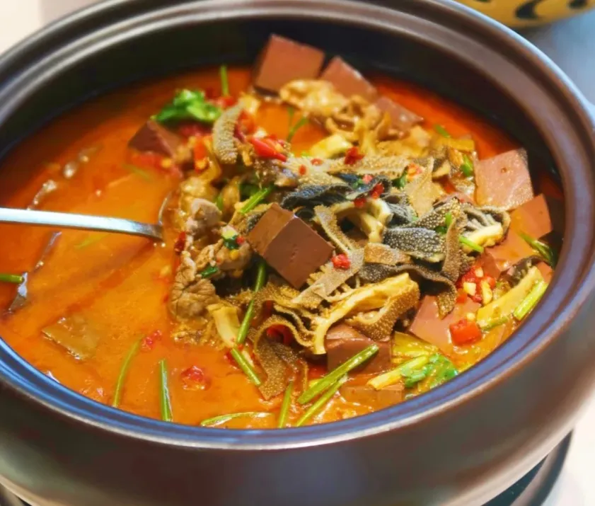 说一道三合汤:先把牛肉、牛肚、牛血分别处理干净,姜蒜、辣椒下锅煸出香,再一并入汤煮。火候不能急,得让牛杂的韧劲和鲜味慢慢出来。最后撒蒜叶,端上桌时,汤面还在轻轻冒泡。