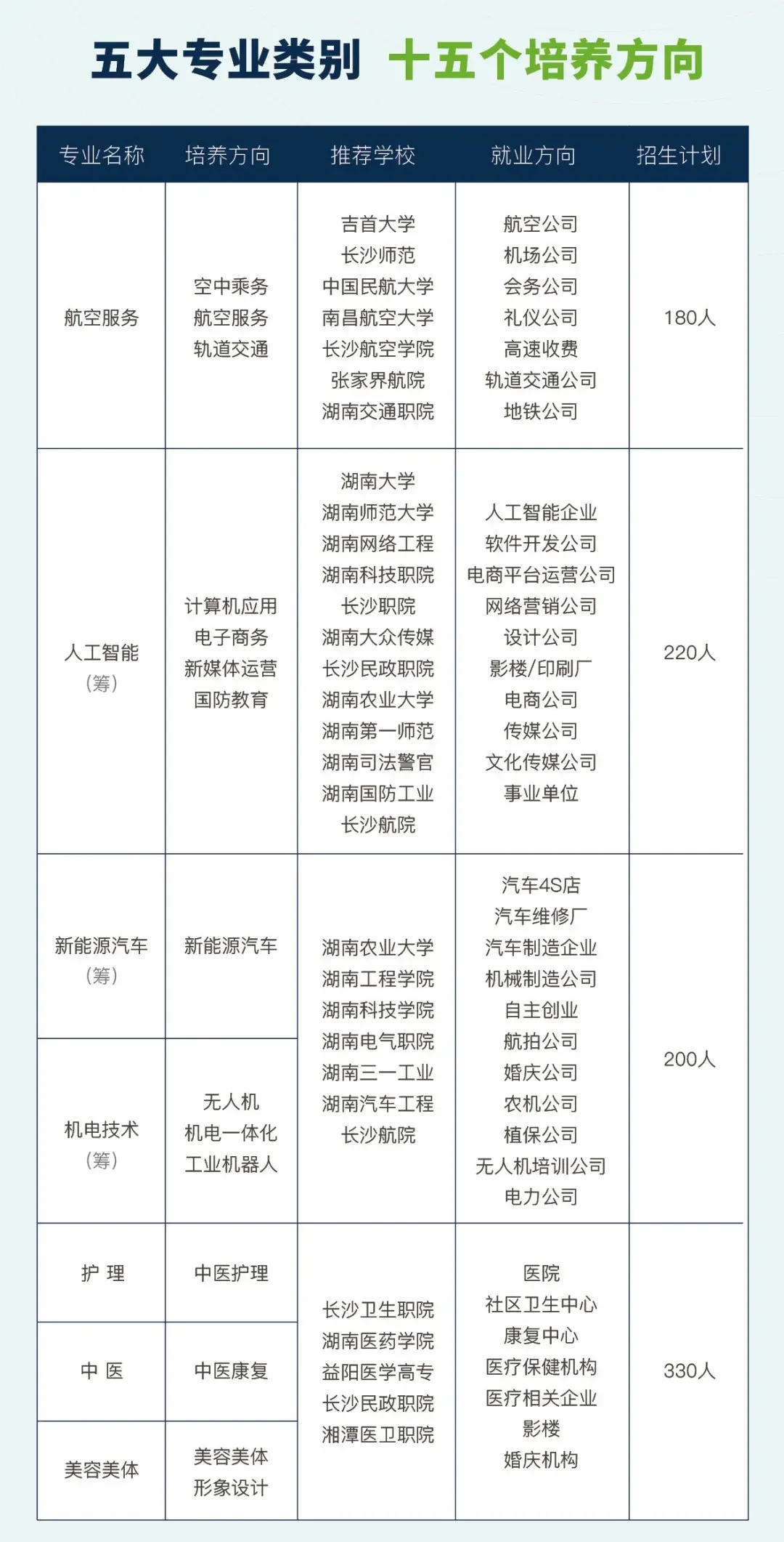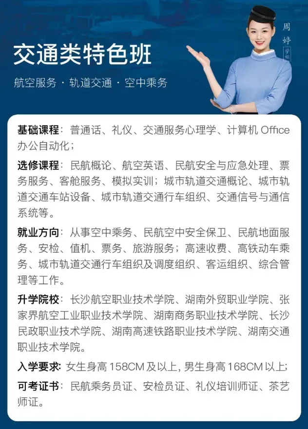 长沙市通航中等职业学校是由长沙市教育局直属管理的全日制中等职业学校。学校开设护理、航空服务、轨道交通、计算机、新能源汽车、机电一体化、无人机、中医康复技术、美容美体艺术等多个特色专业方向。