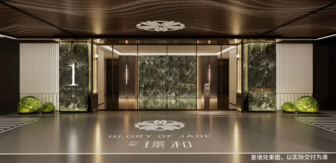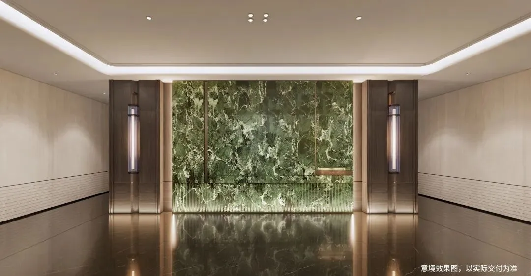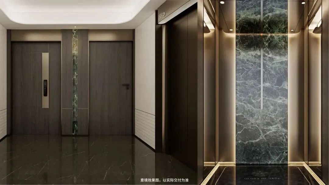酒店式一体化美化设计,电梯门楣上方均用金属雕刻项目图腾,门牌:意大利大花绿岩板+氛围灯,彰显业主气质;电梯轿厢正面采用大版面意大利大花绿岩板,镜面金属吊顶,地面为定制墨染流云奢石嵌以金属logo,侧面配置了人脸识别的梯控面板,无触归家
