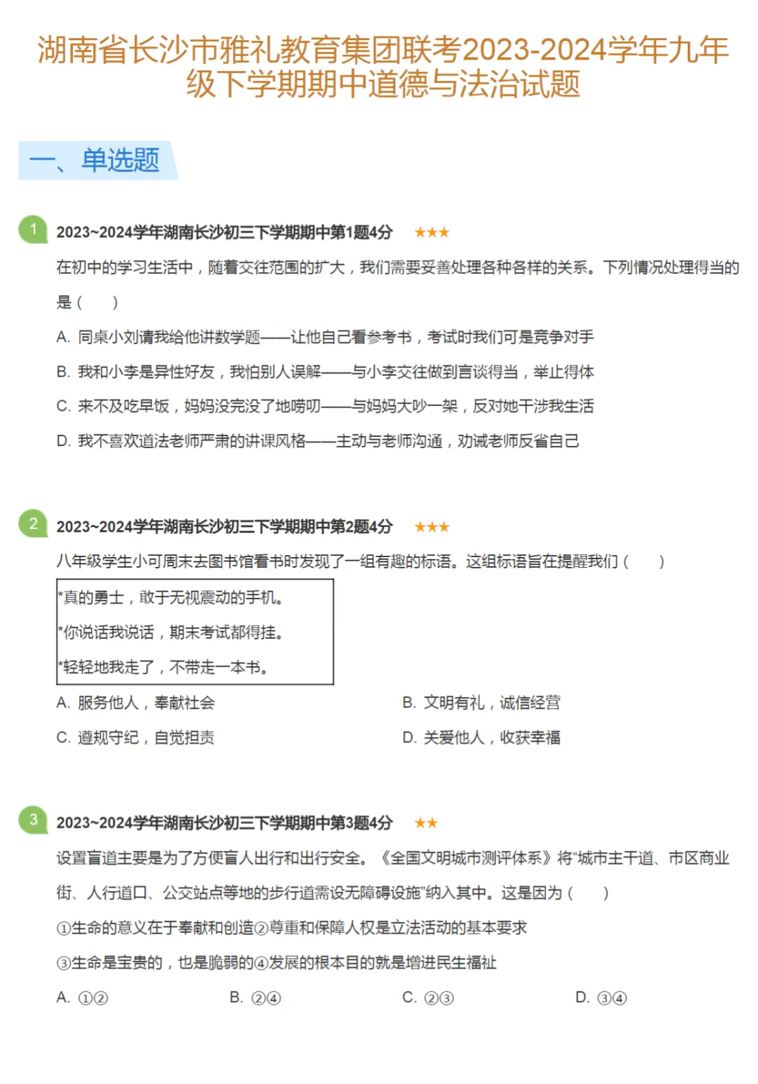 14套2018-2024年湖南长沙初三下学期期中政治试卷及答案解析