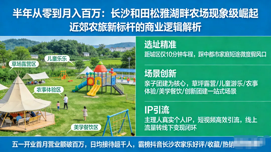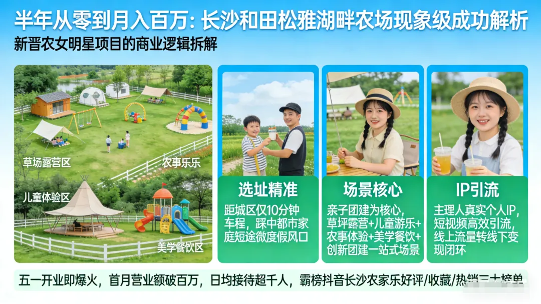 “和田松雅湖畔农场”爆火,不是一场偶然的狂欢,而是一次商业逻辑胜利。它用精准选址解决“获客半径”,用场景体验解决“留客能力”,用主理人IP解决“流量成本”。这3个维度环环相扣,构成了一个坚不可摧的商业闭环。