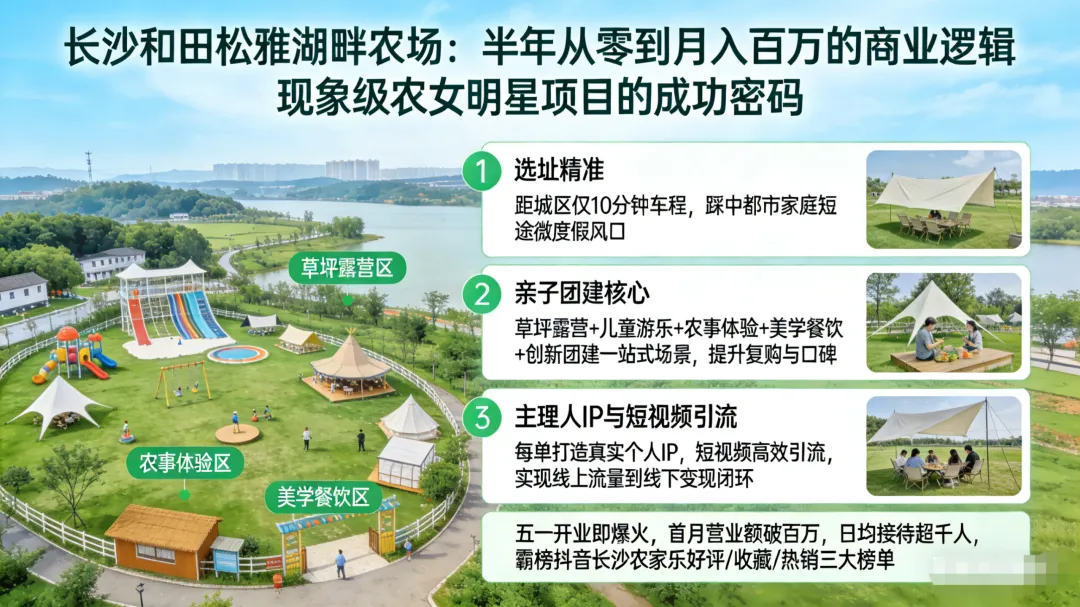 这不是神话,这是发生在长沙“和田松雅湖畔农场”的真实故事。当无数农场主还在为“周末有人、周中没人”发愁,为同质化的滑梯、烧烤架头疼时,这家由2位女性主理人——美丹和她的姐妹,带着积蓄返乡打造的农场,去年五一开业即巅峰,日均接待超千人,一举霸榜抖音长沙农家乐好评、收藏、热销3大榜单。