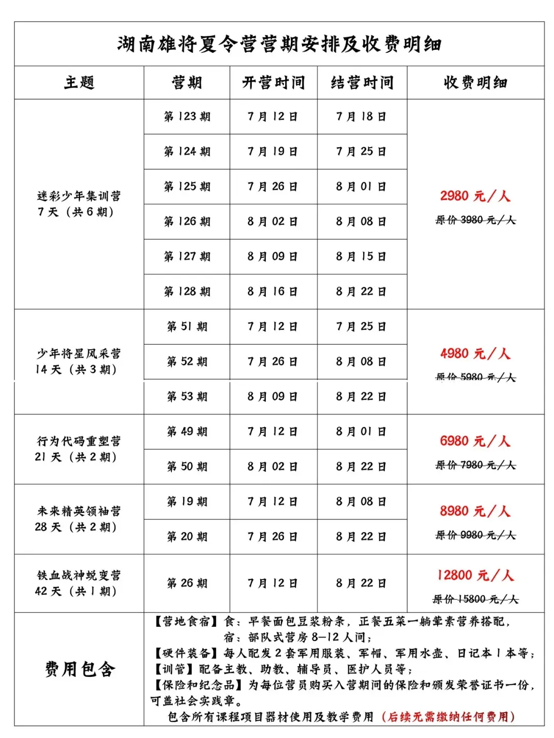 夏令营发放物品:两套训练服、一顶军帽、一个军用水壶、一个军用背包。(详情请参考入营须知文件)