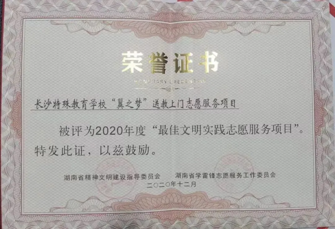 学校成立“翼之梦”志愿服务队,积极开展志愿服务。组织党团员教师送教上门、为家长开展手语培训、校门口“护学”、社区疫情防控等多个志愿服务项目。组织盲生“进社区义务按摩”、聋生进社区进行“垃圾分类”“义务缝补”等志愿服务活动。使志愿服务成为学校文明创建的特色品牌。2021年学校送教上门志愿服务被湖南省精神文明建设指导委员会、湖南省学雷锋志愿服务工作委员会评为“最佳文明实践志愿服务项目”。