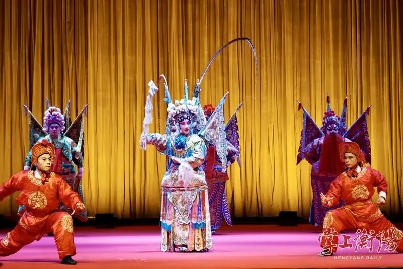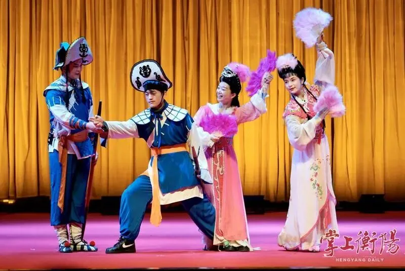 值得一提的是,观众席中还有36位外地来衡的游客。花鼓戏《刘海砍樵》的演员邀请外地游客同台互动,成为当天最欢乐的环节。来自娄底的游客穿上戏服、学唱腔、比身段,沉浸式体验衡阳非遗魅力。