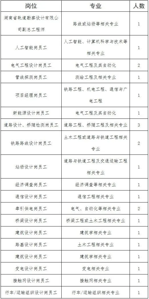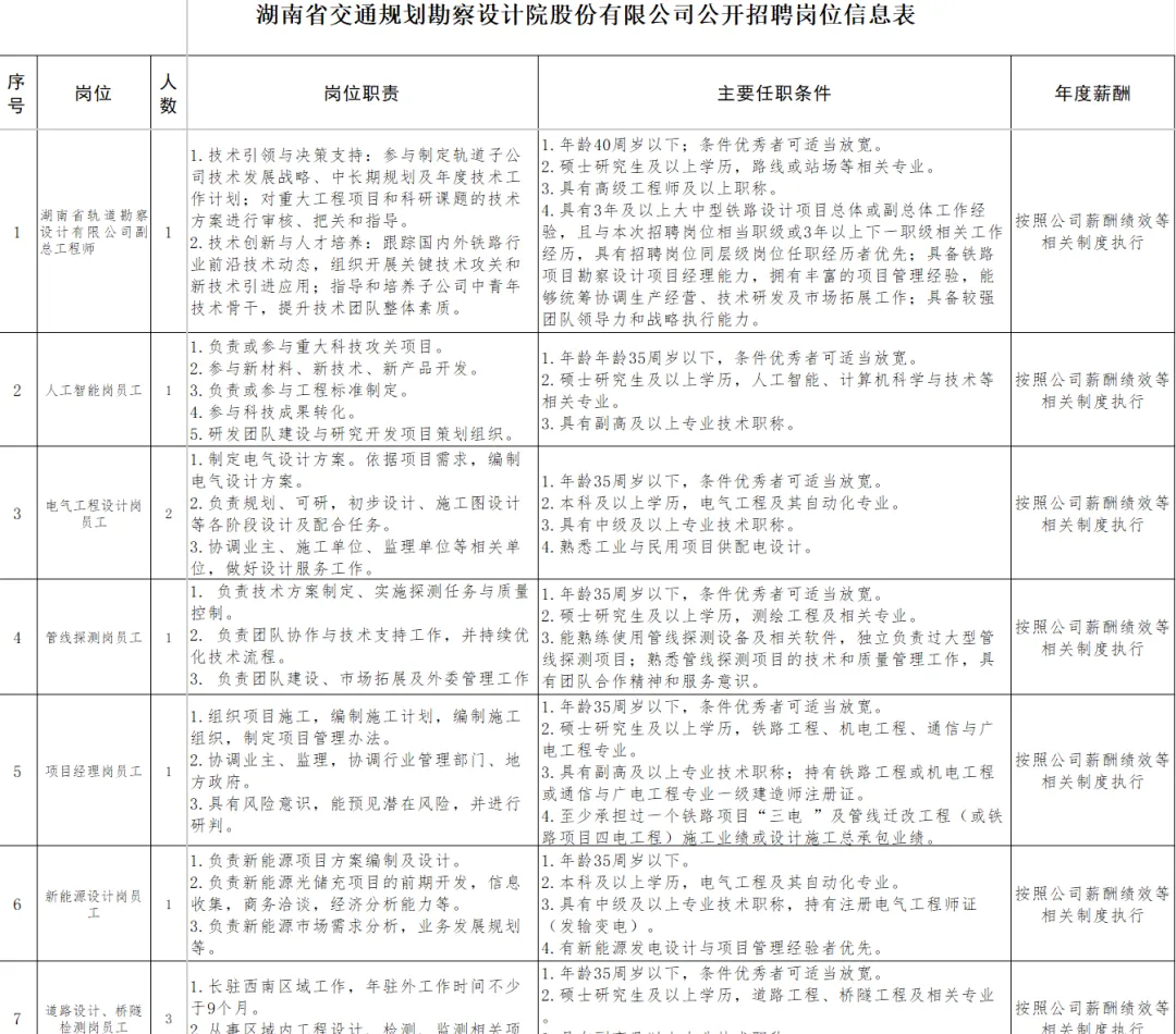 本次共计划招聘人数24人,招聘岗位及资格标准条件详见《湖南省交通规划勘察设计院股份有限公司公开招聘岗位信息表》(附件1)。