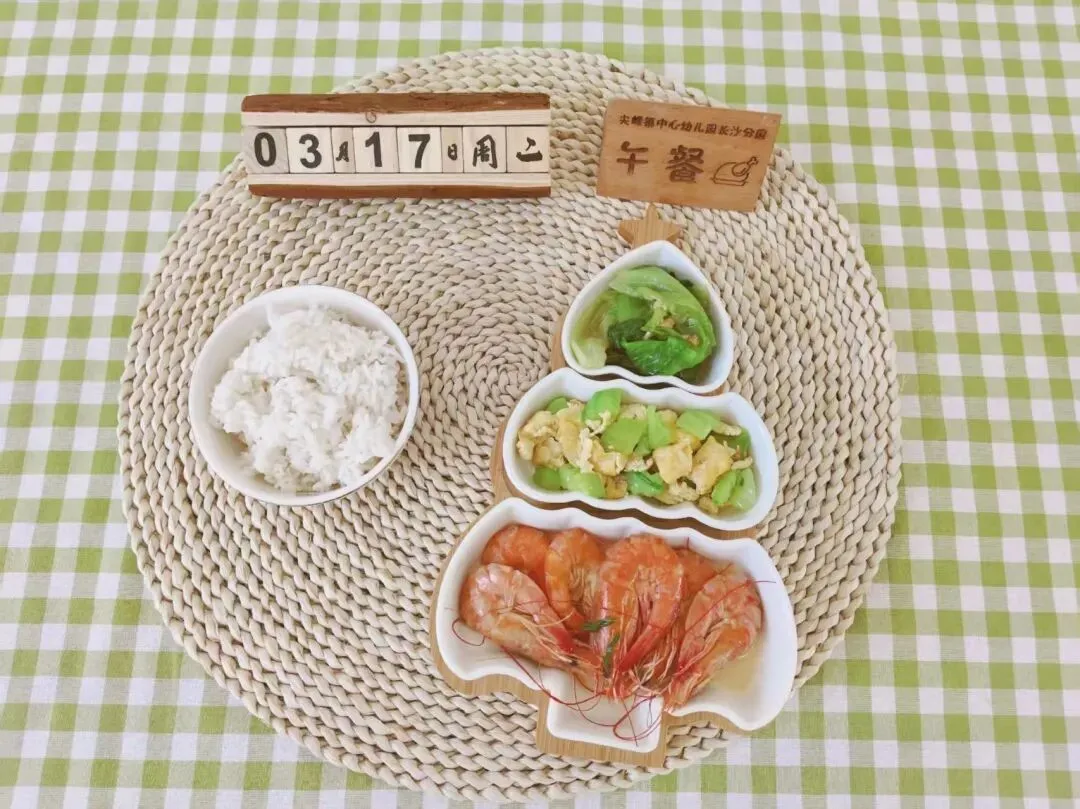 油焖大虾、青瓜炒鸡蛋、蚝油生菜、白米饭