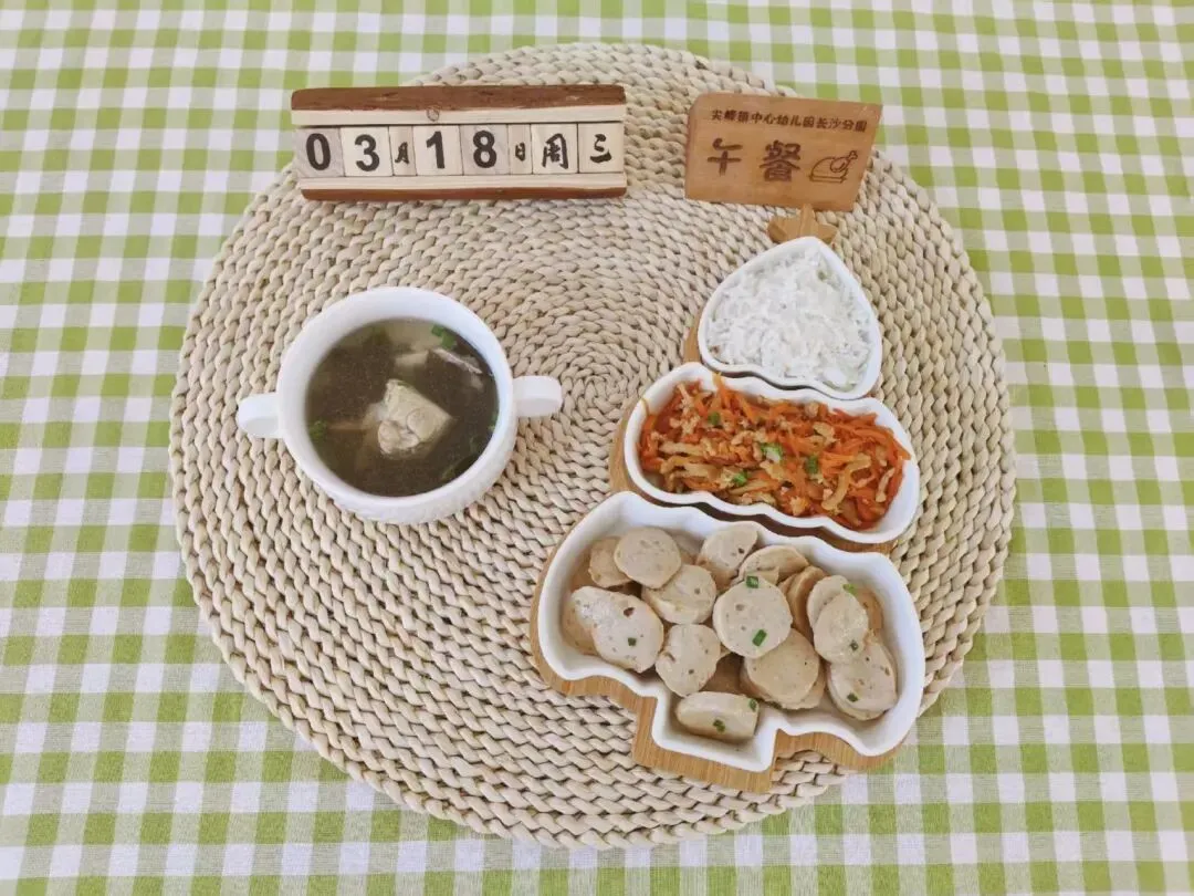 手打猪肉丸、胡萝卜炒肉丝、海带骨头汤、白米饭