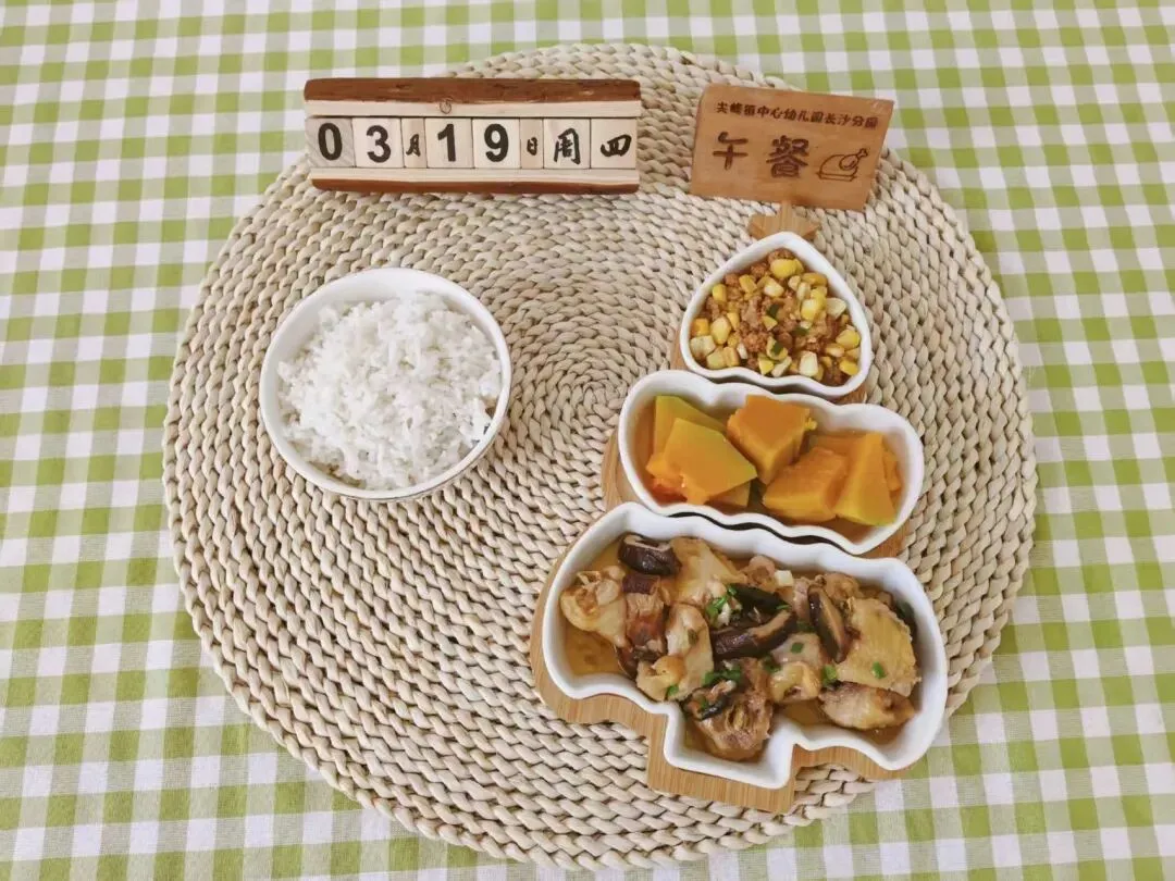 香菇蒸鸡肉、肉沫玉米粒、清蒸南瓜、白米饭