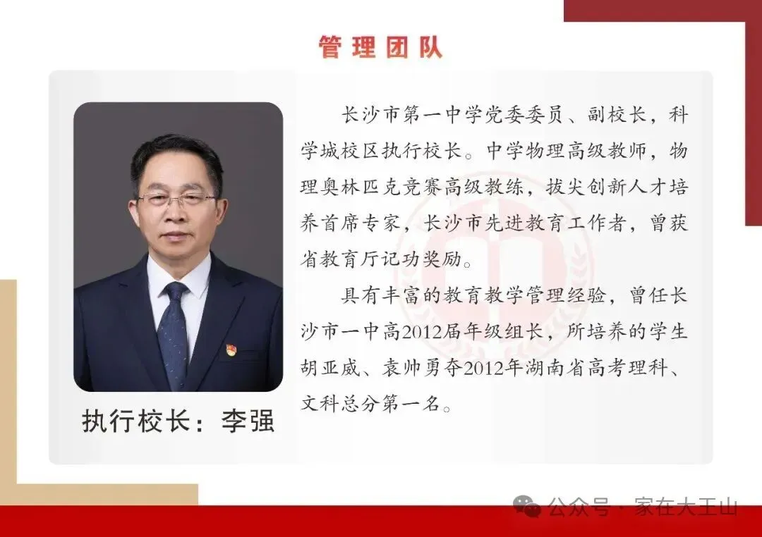 初中部校长:李强,之前担任长沙市一中双语校长,中学物理高级教师,国家级骨干教师,国际奥林匹克竞赛高级教练,拔尖创新人才培养首席培训专家。