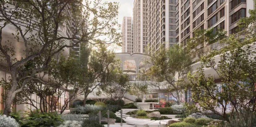 A30住宅地块容积率仅2.0,限高80米,建筑密度仅约17%,超83%的土地用于园林景观与公共空间。