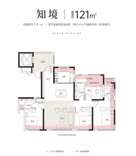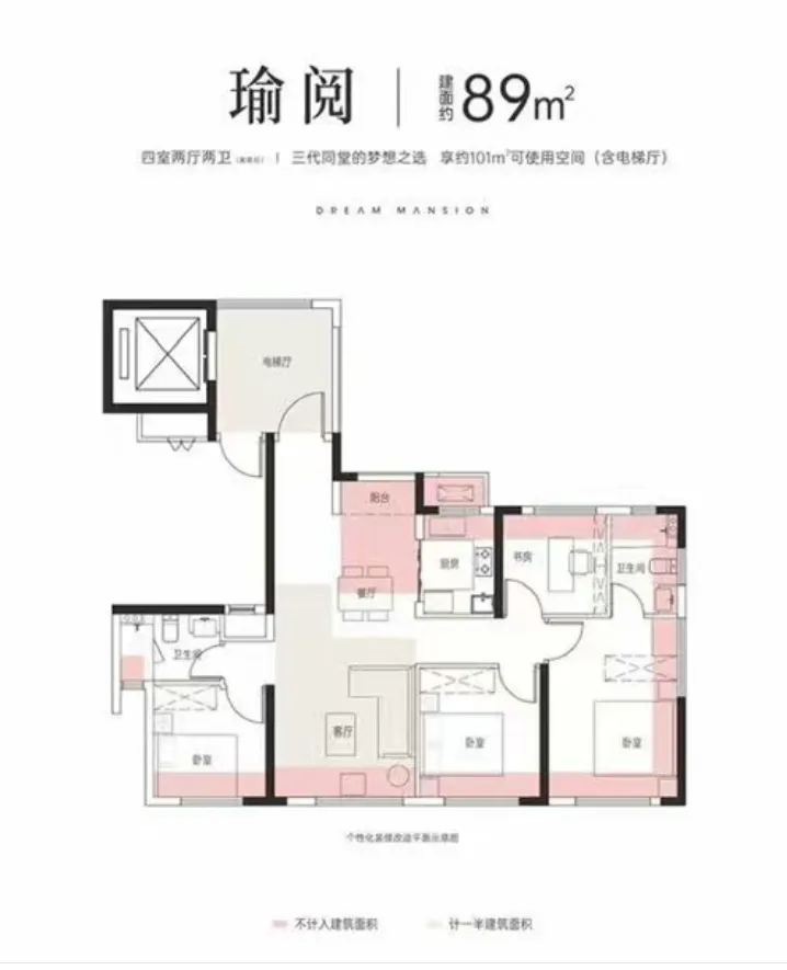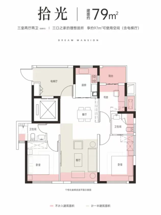 纯板楼小高层+私梯入户,三房两卫设计,可使用空间(含电梯厅)约97m²,得房率约123%,应该是长沙首批79平方做三房两卫!