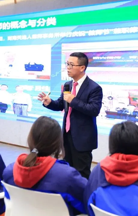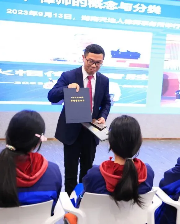 初步了解了律师职业工作环境,同学们进一步探索律师的发展历程。湖南天地人律师事务所教育法律服务团队首席律师、中共长沙市委党校法学副教授伍贤华以“中国律师职业解析”为主题开展法治讲座,向同学们深入介绍中国律师发展历史和现状,及对未来的律师职业的思考。