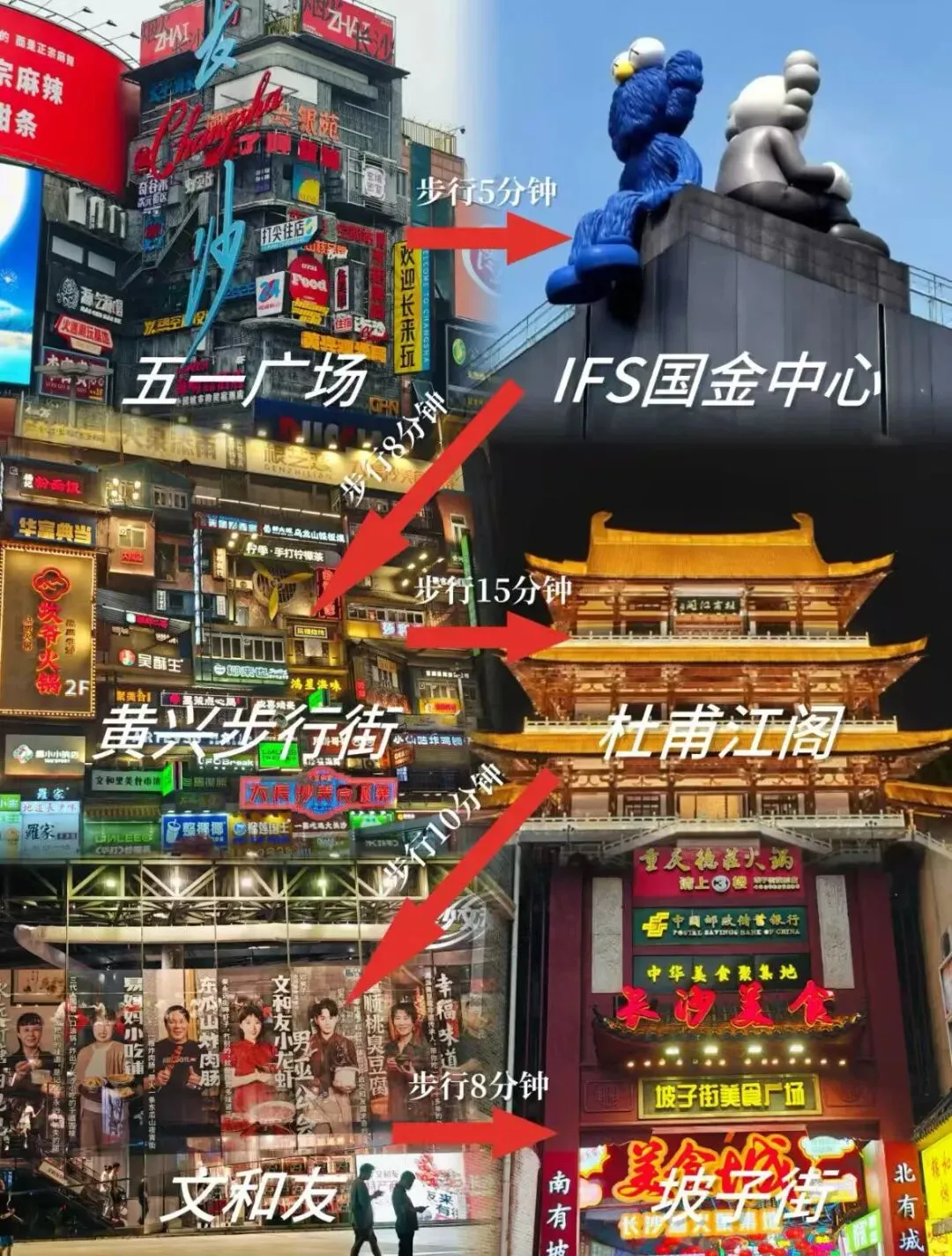 五一广场、IFS国金中心、黄兴步行街、坡子街、文和友、杜甫江阁……