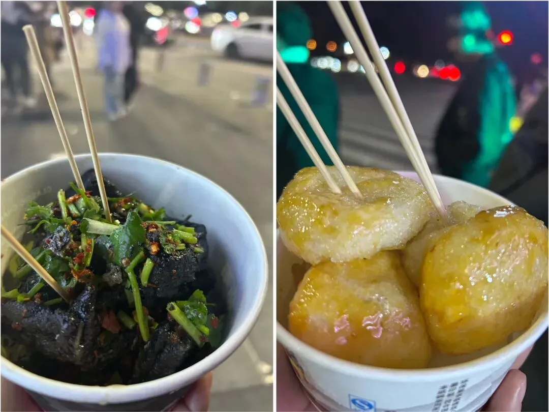 一看时间还早,想着先吃点东西,我在路边买了一碗臭豆腐垫肚子,现在摊位前看着师傅炸,很香,一口下去,真巴适。
