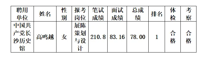 根据《2025年长沙市直事业单位第二批公开招聘工作人员公告》要求,中共长沙市委党史研究室所属事业单位中国共产党长沙历史馆公开招聘展陈策划与设计岗工作人员1名,经网上报名、专业测评、笔试、资格审查、面试、体检、考察等程序,拟聘用高鸣越同志,现予以公示如下,公示时间为2026年3月23日至2026年3月29日。